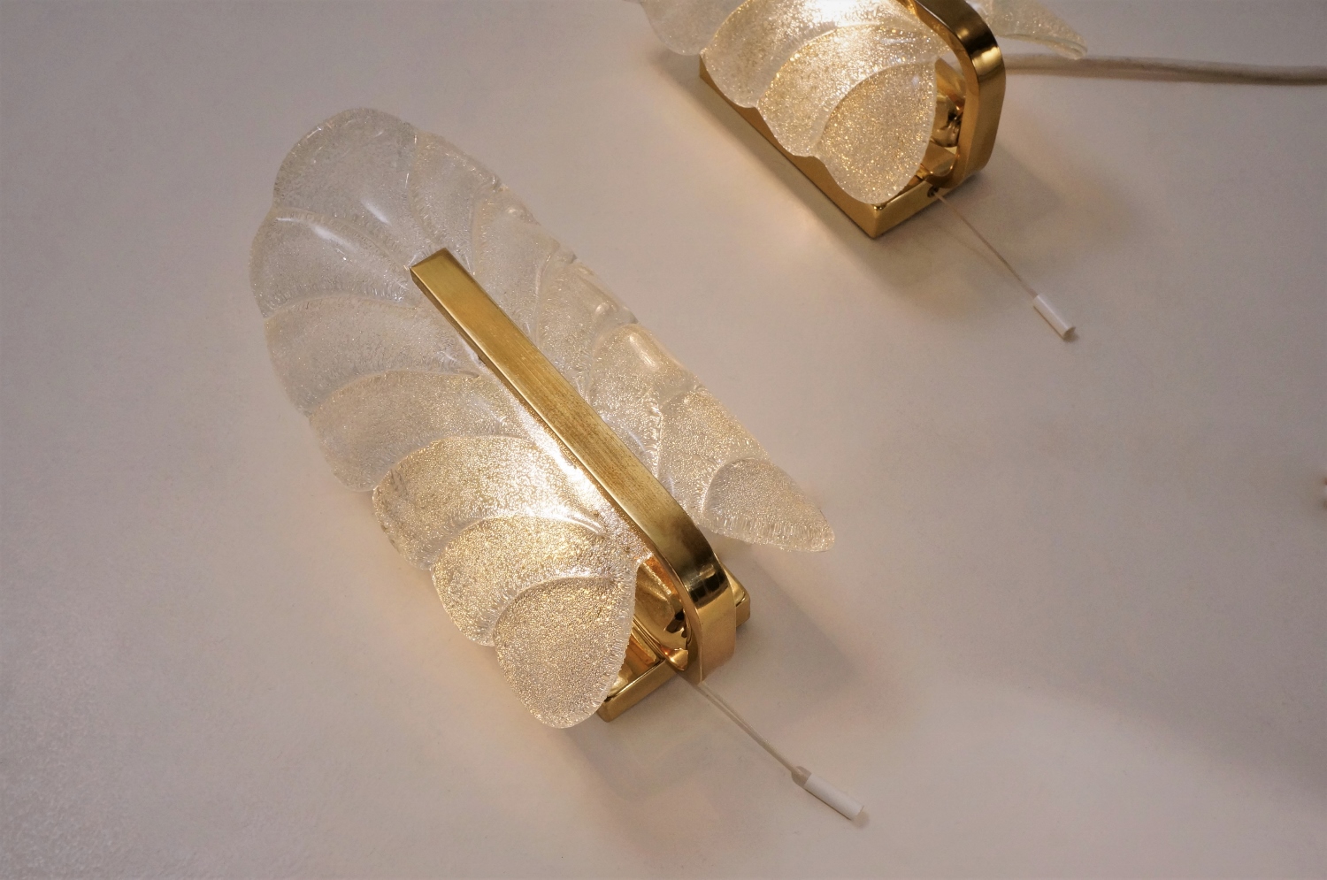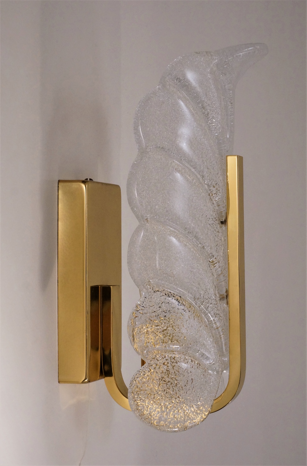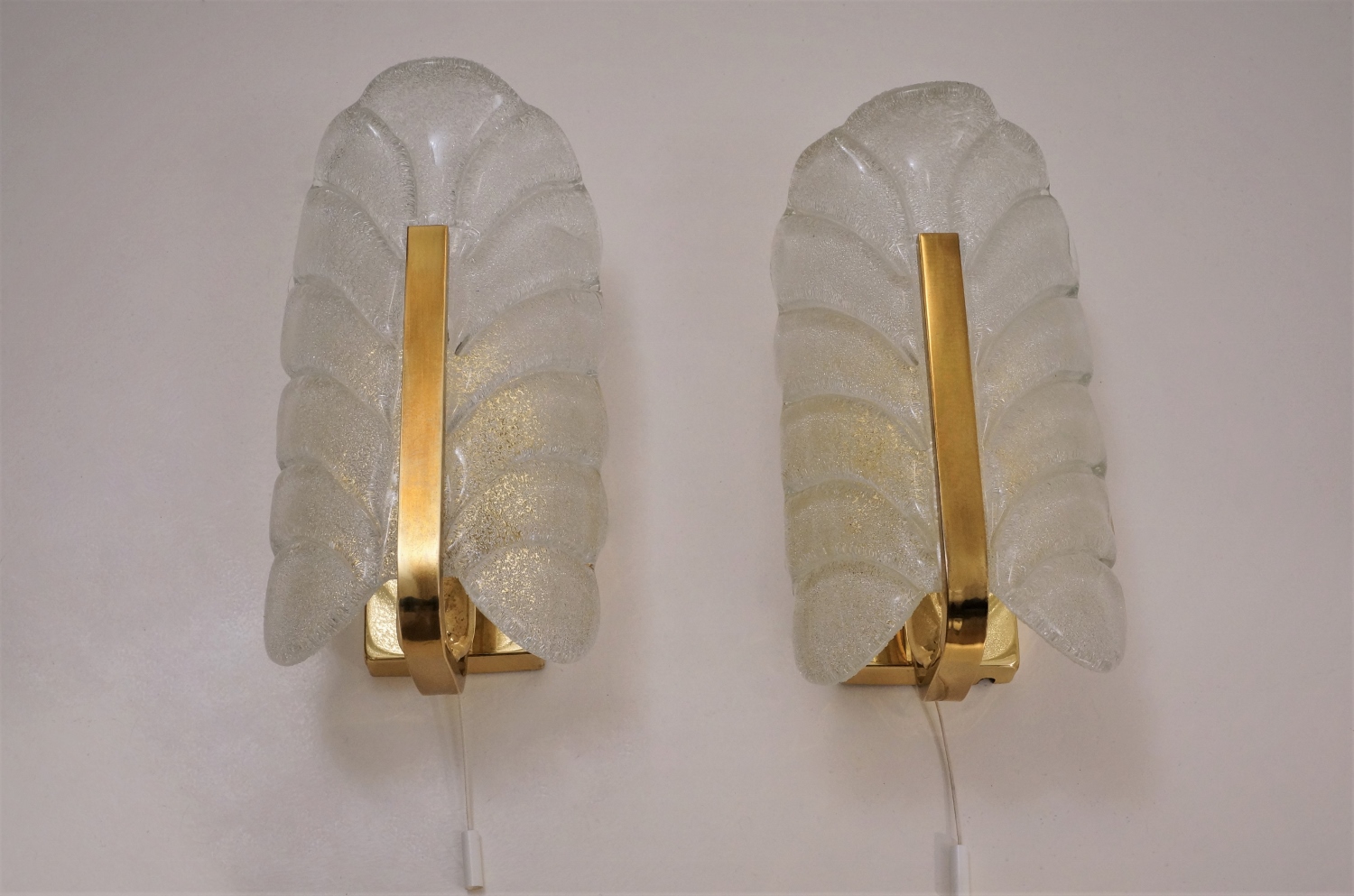 Each sculptural clear glass shade is shaped with a textured acanthus leaf shape. The shade is indented in the centre to `rest` on the brass arm giving this piece depth & volume. The upper edge of the glass leaf curves slightly outwards to finish the design. The shades have an external gloss finish, internally there is a layer of sparkling specks of crystal shards creating depth & great reflections. The glass shade securely attaches by two decorative brass screws internally to the arms. The shade is removeable for cleaning & packing.