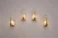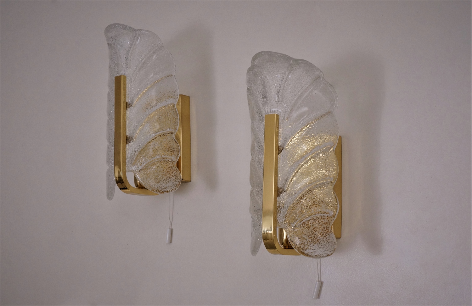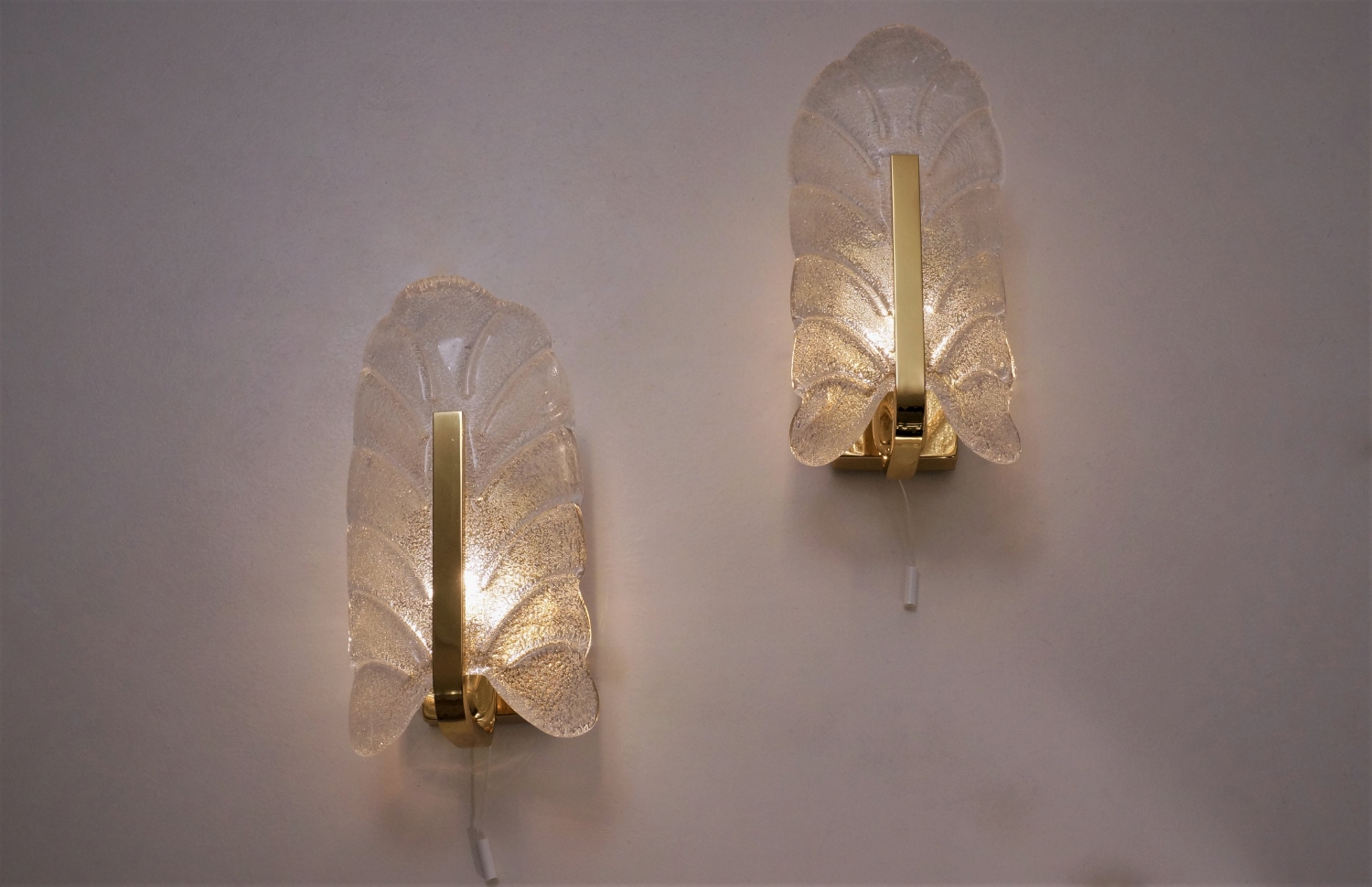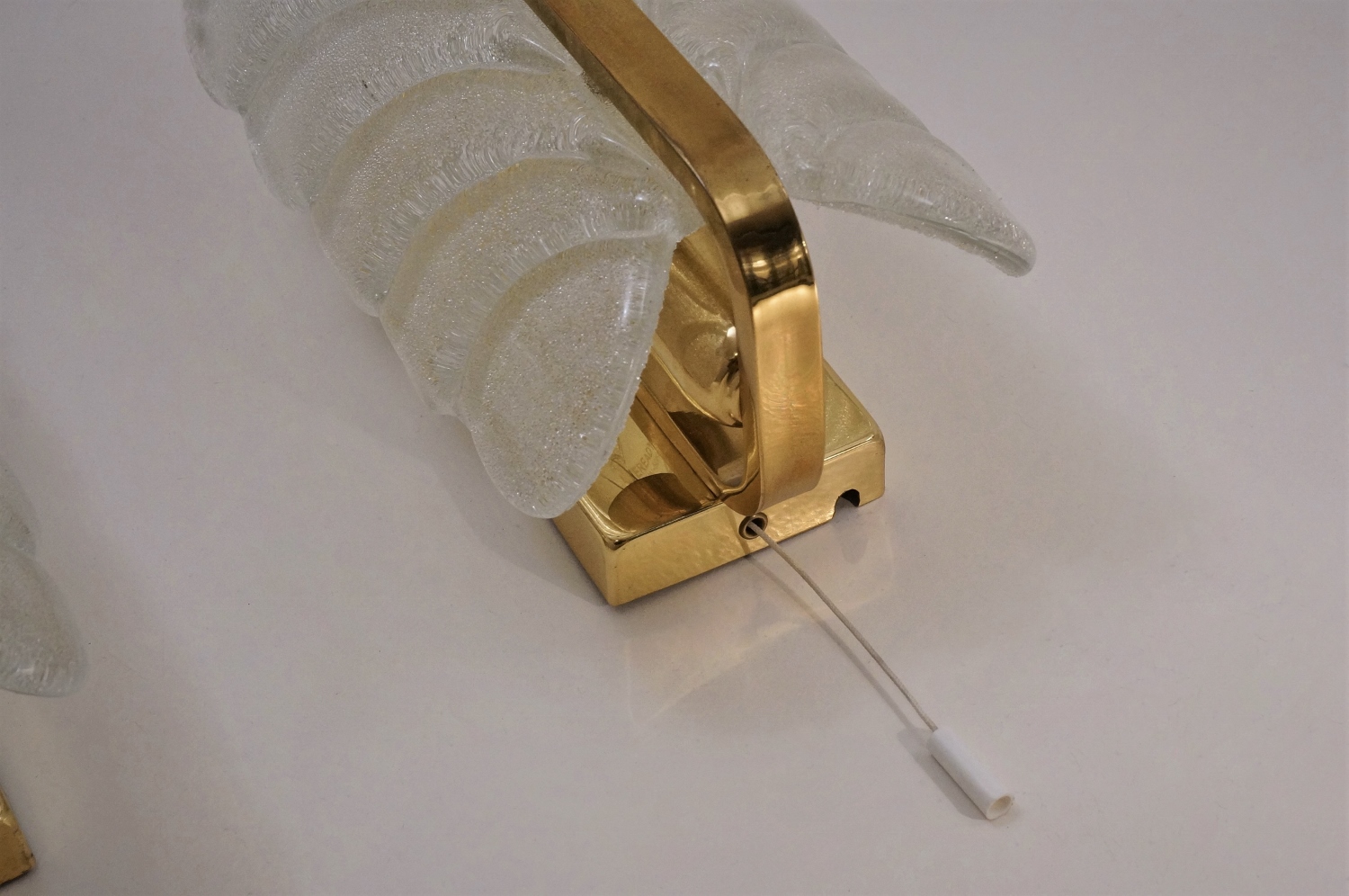 Each sculptural clear glass shade is shaped with a textured acanthus leaf shape. The shade is indented in the centre to `rest` on the brass arm giving this piece depth & volume. The upper edge of the glass leaf curves slightly outwards to finish the design. The shades have an external gloss finish, internally there is a layer of sparkling specks of crystal shards creating depth & great reflections. The glass shade securely attaches by two decorative brass screws internally to the arms. The shade is removeable for cleaning & packing.