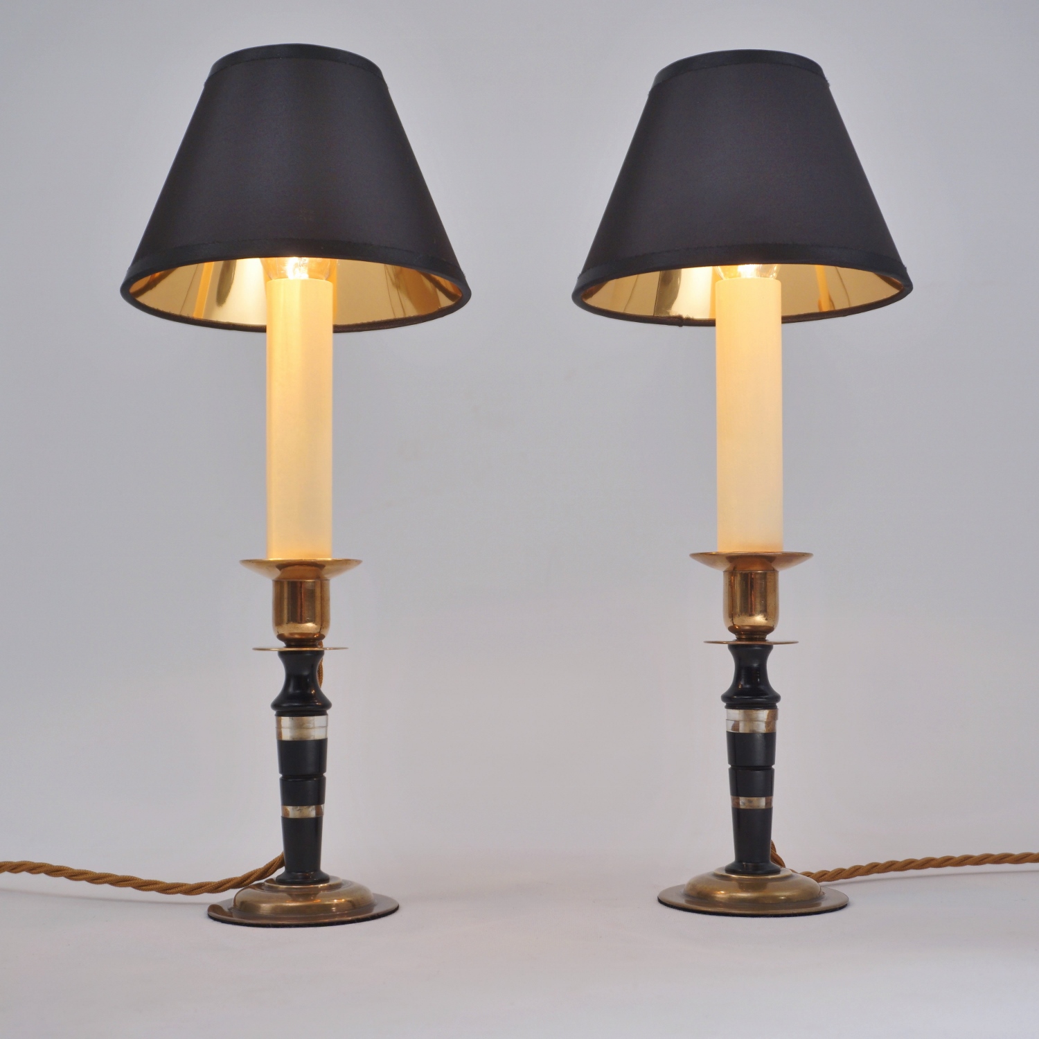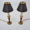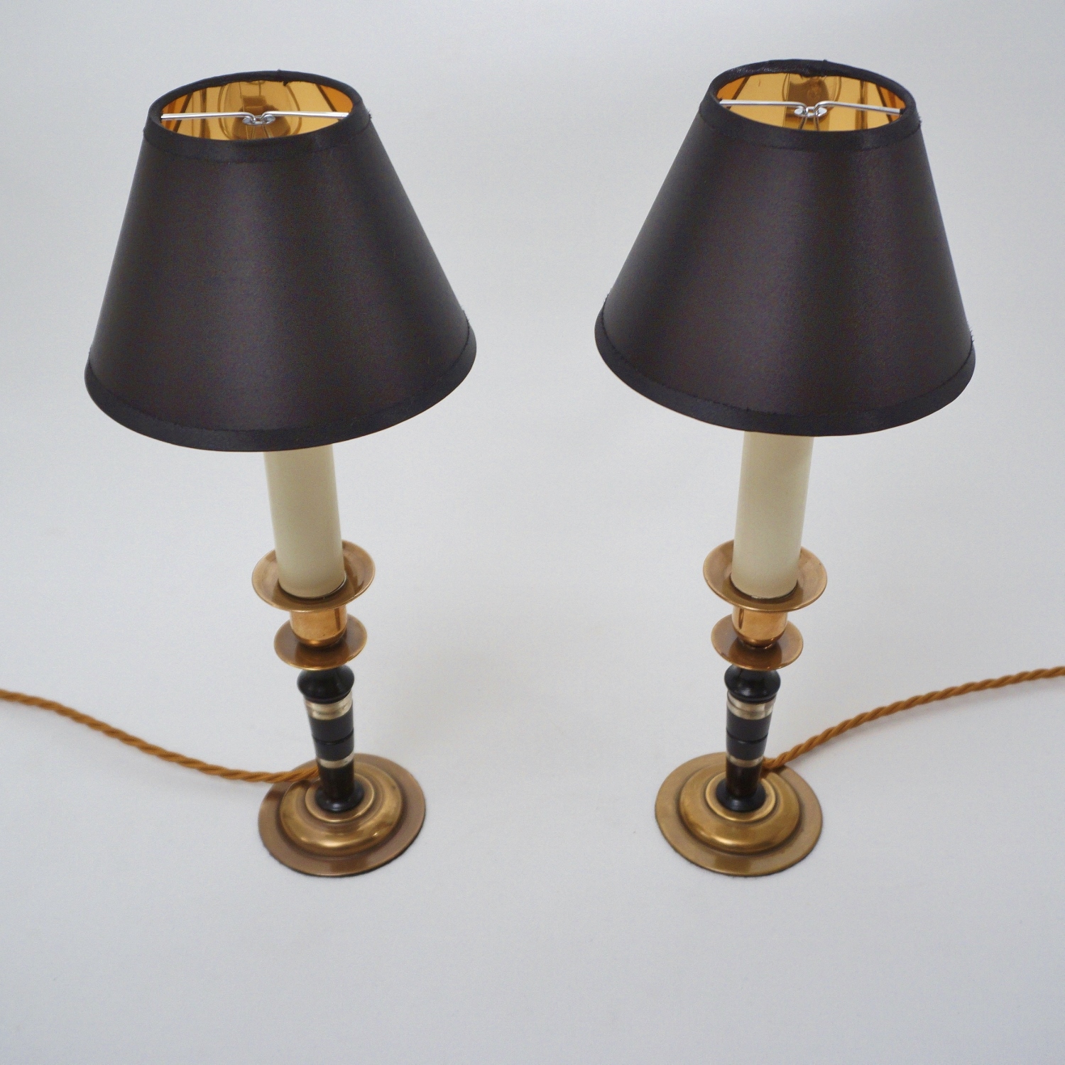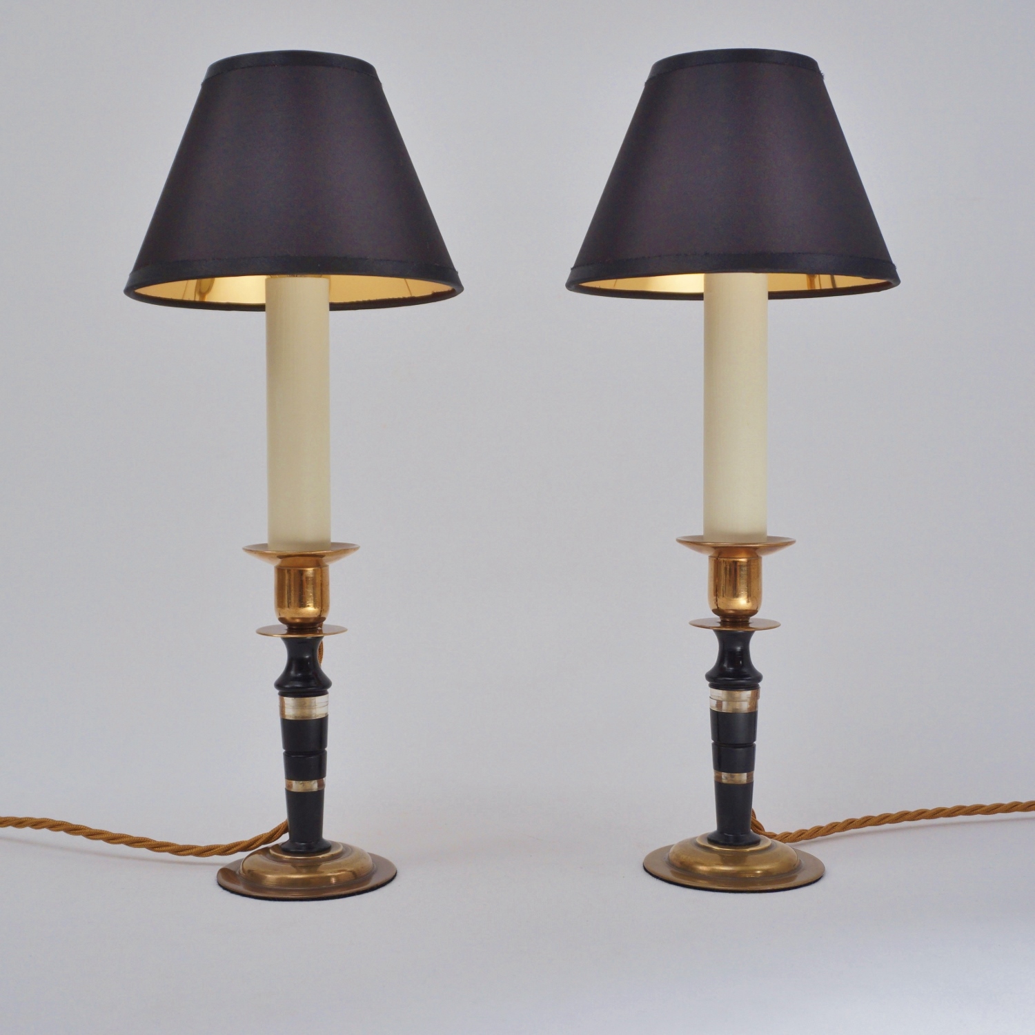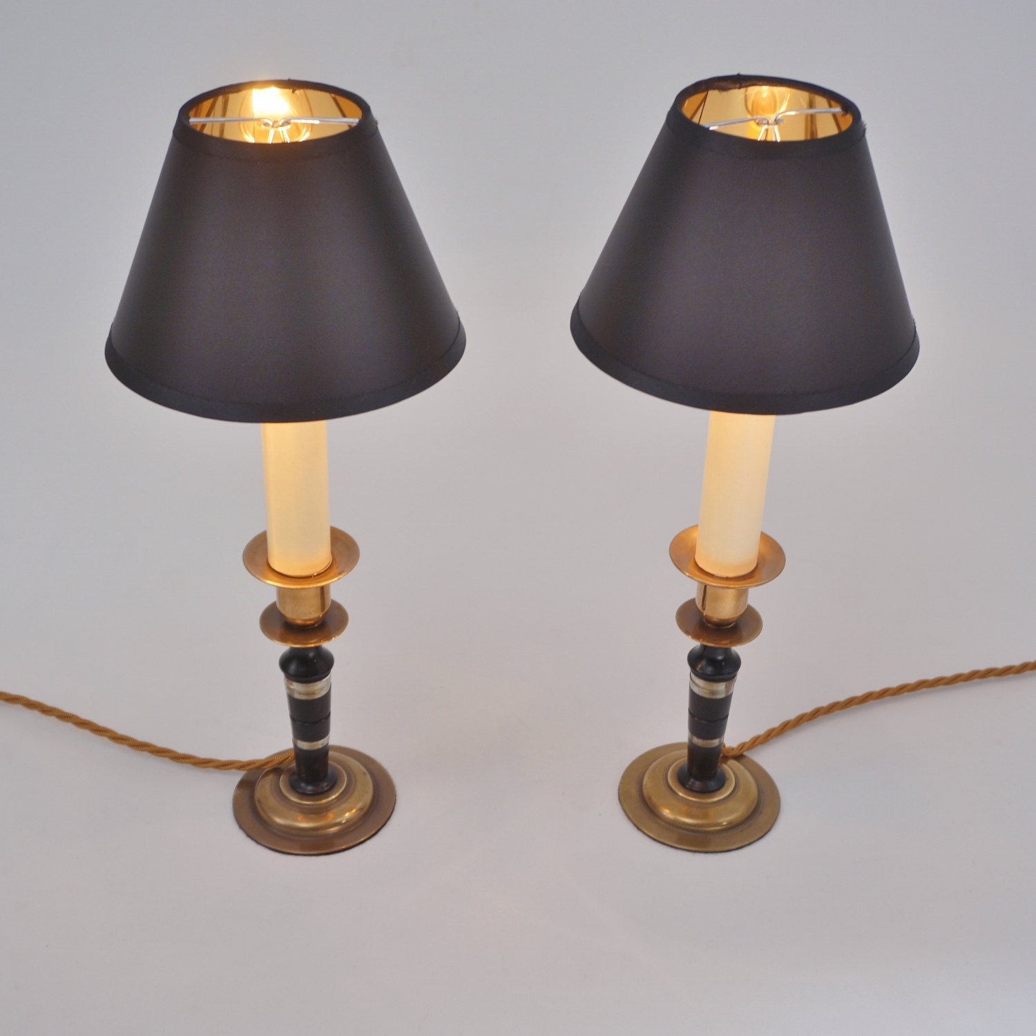 Both lamps are finished with new clip-on black silk lampshade lined metallic gold. This complements the tones of the base.