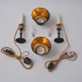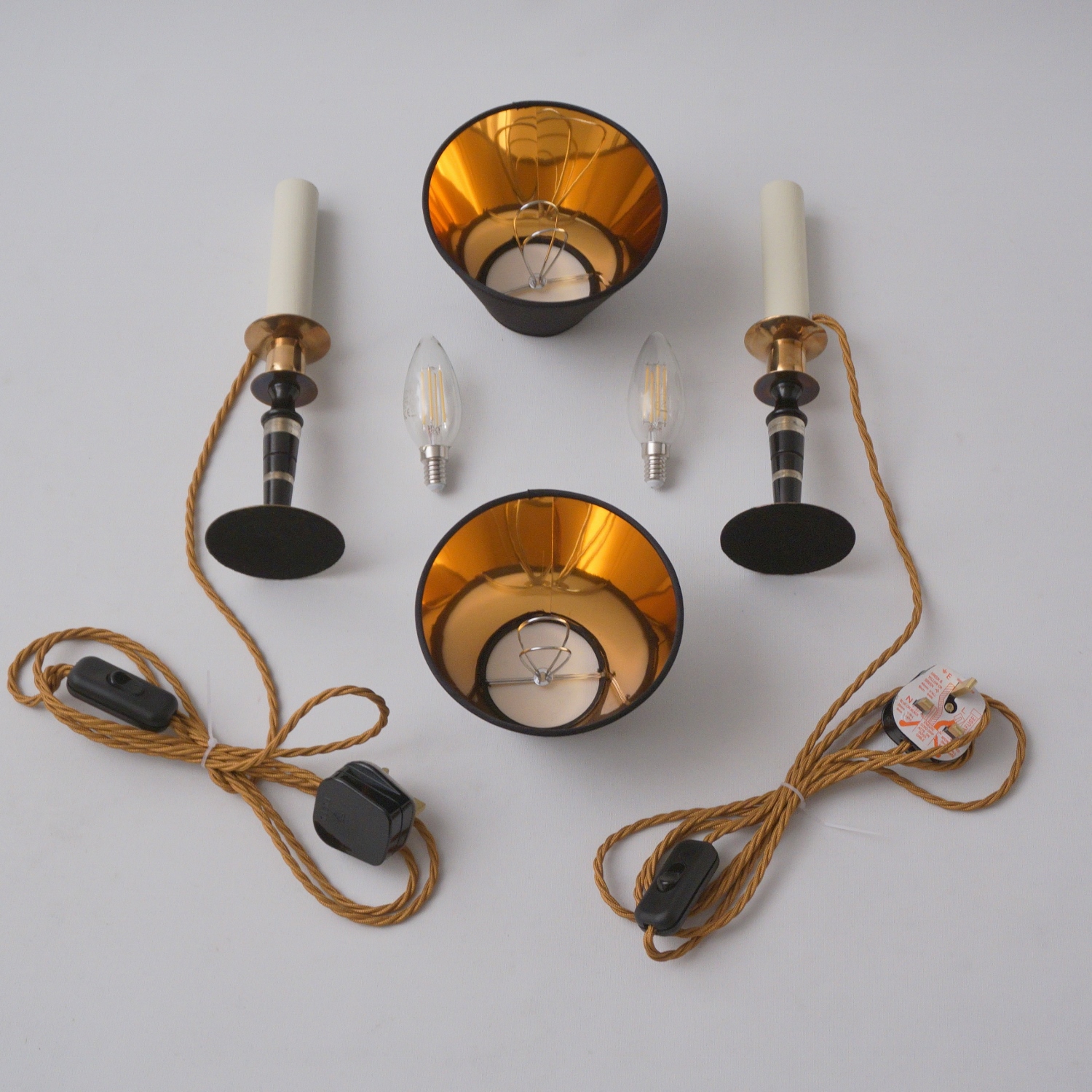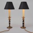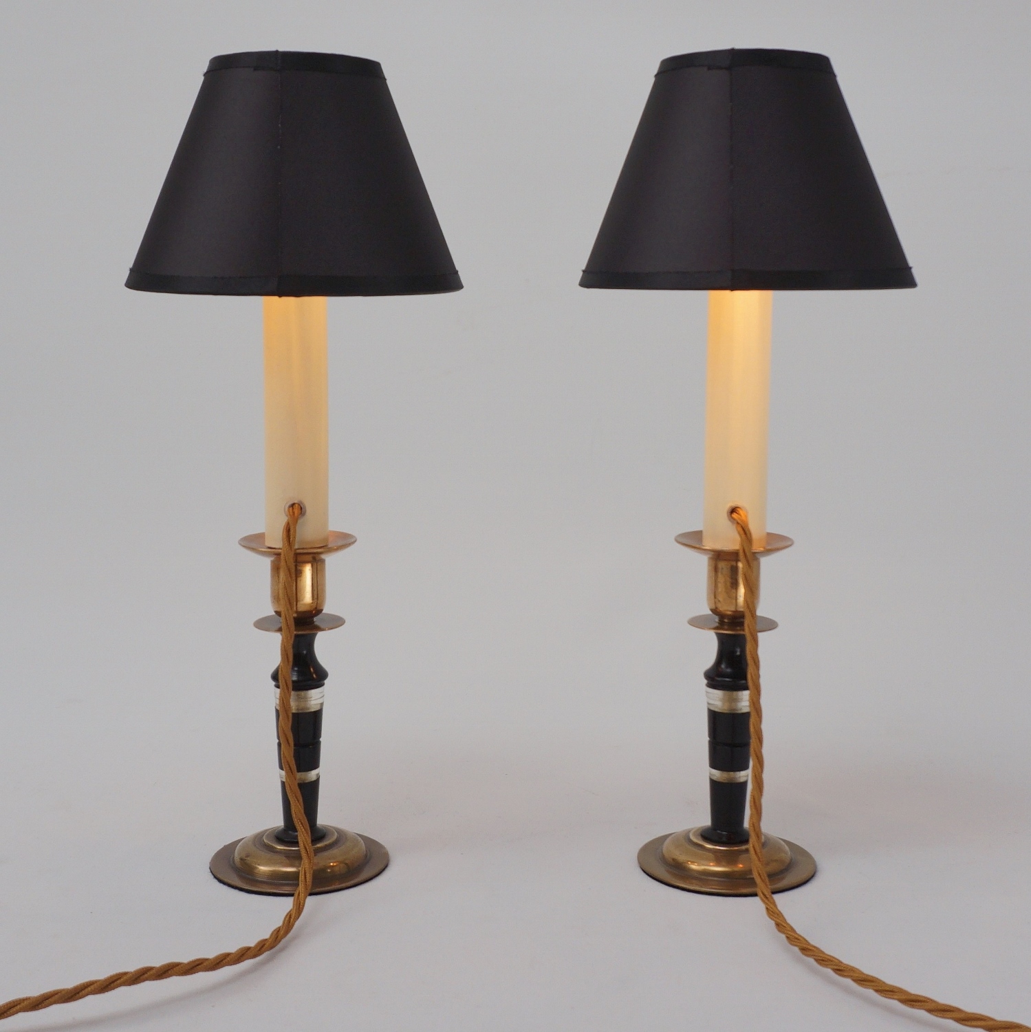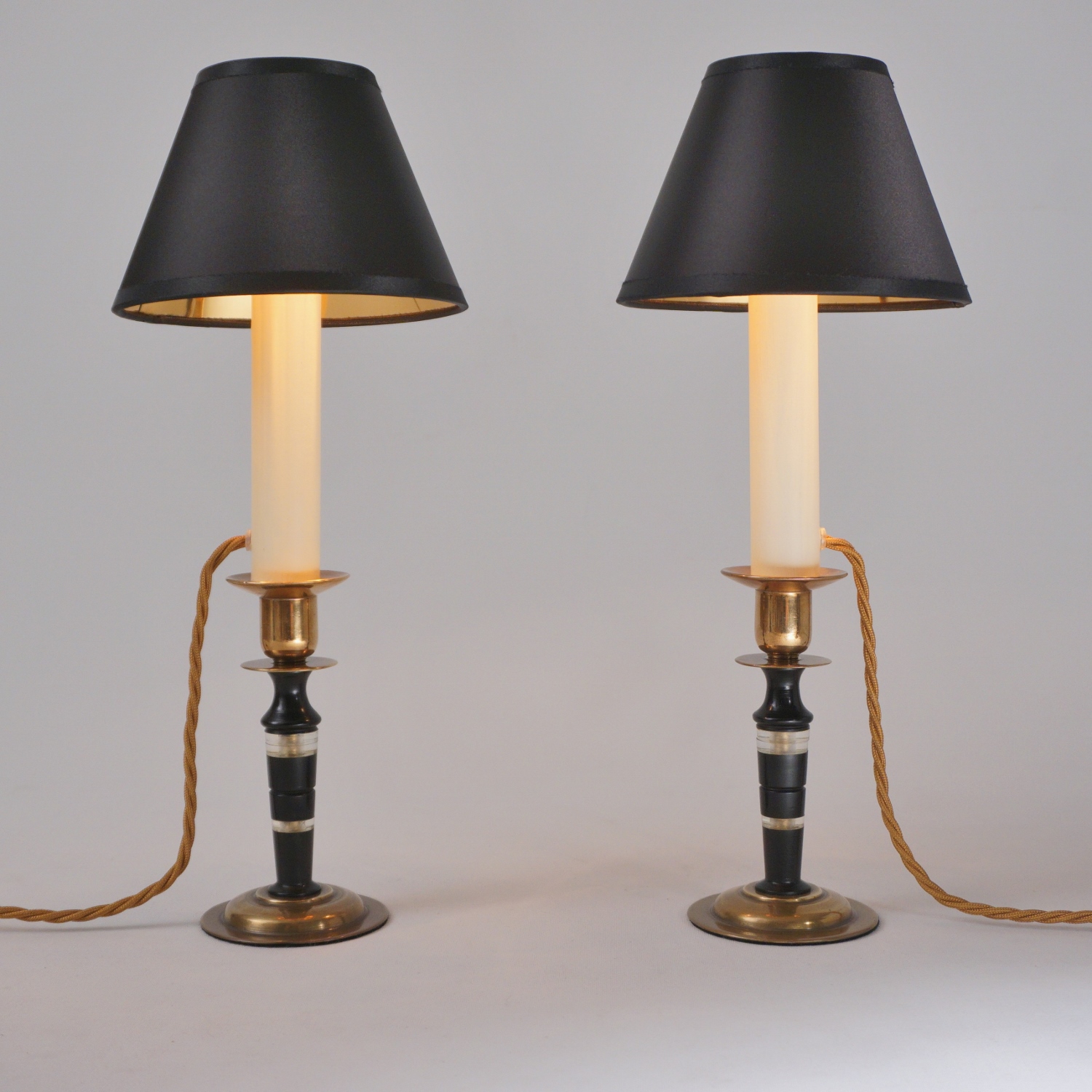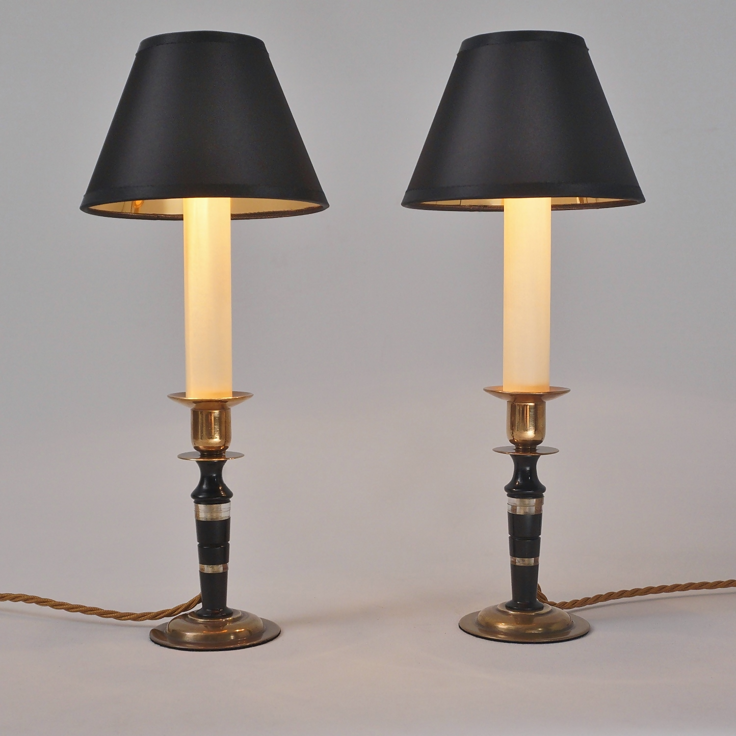 Both lamps are finished with new clip-on black silk lampshade lined metallic gold. This complements the tones of the base.