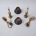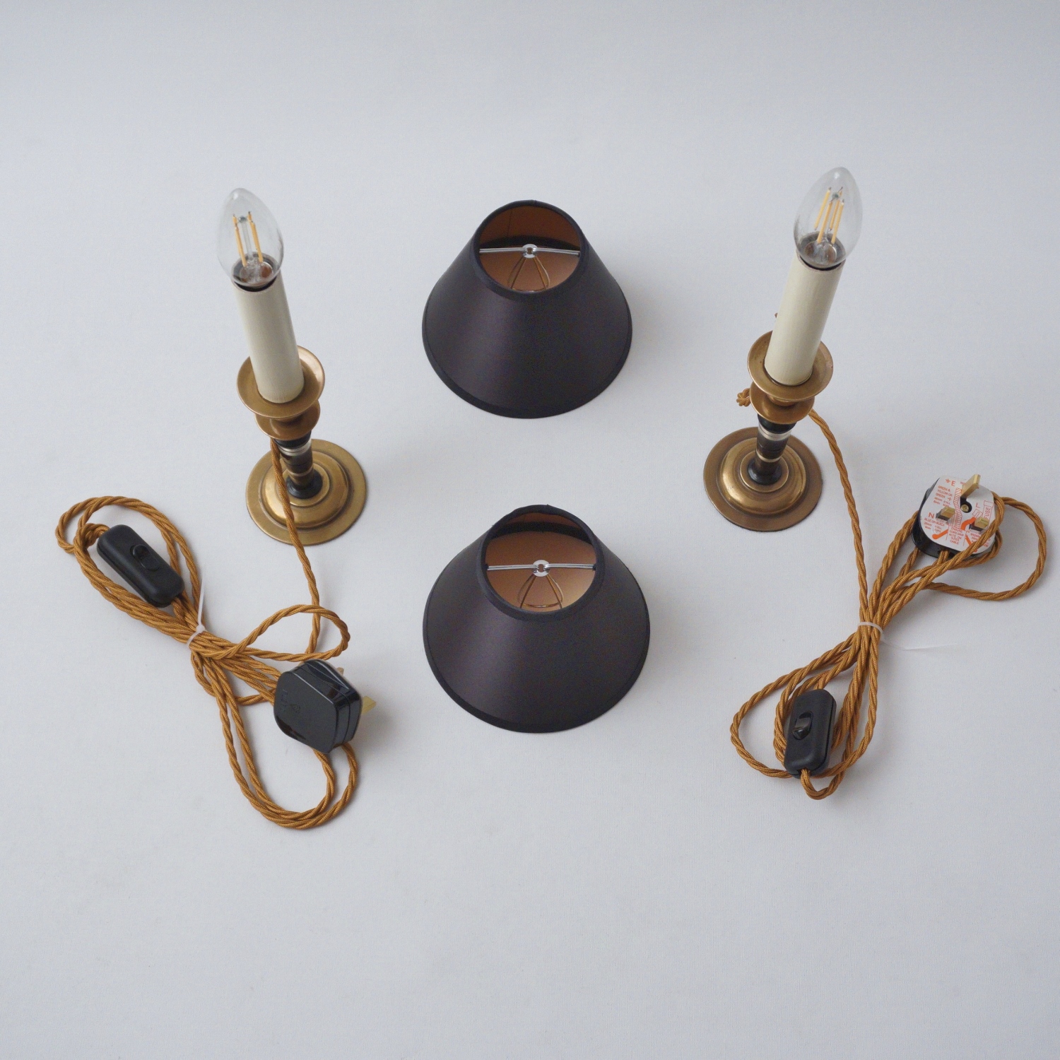 This pair of vintage lamps have been gently cleaned while respecting the aged patina. They are newly rewired, earthed, PAT tested by an electrician and ready to use. Each has the following new components: lamp holder with a cream card cover, gold silk cable, black cord switch, black plug (UK Plug up to 250V) & clip on silk lampshade. Lightbulbs included. These lamps can be used with a dimmer. It is possible to use these lights in other countries with a light bulb suitable to local electricity.