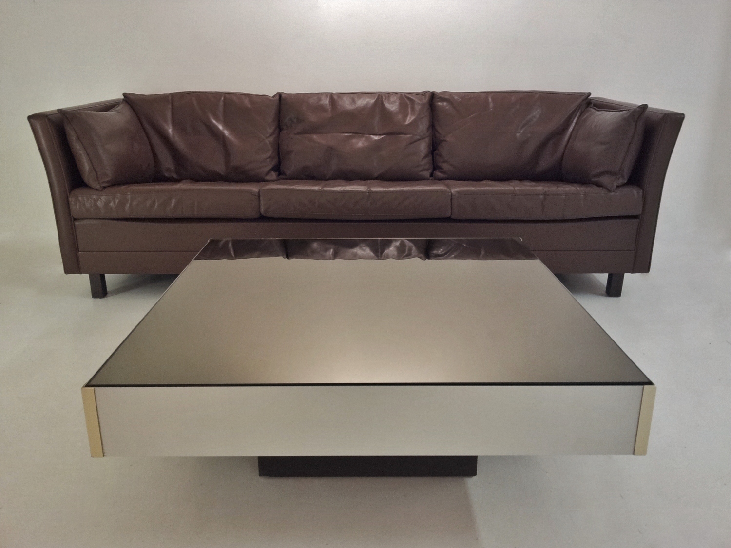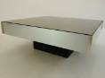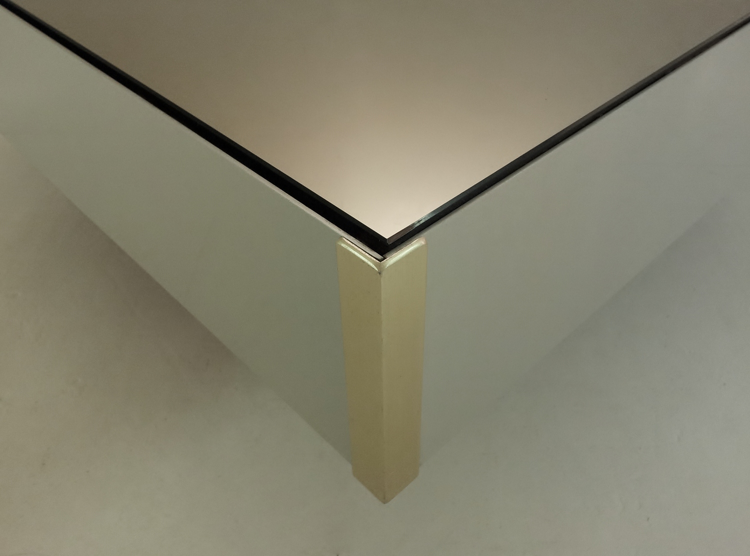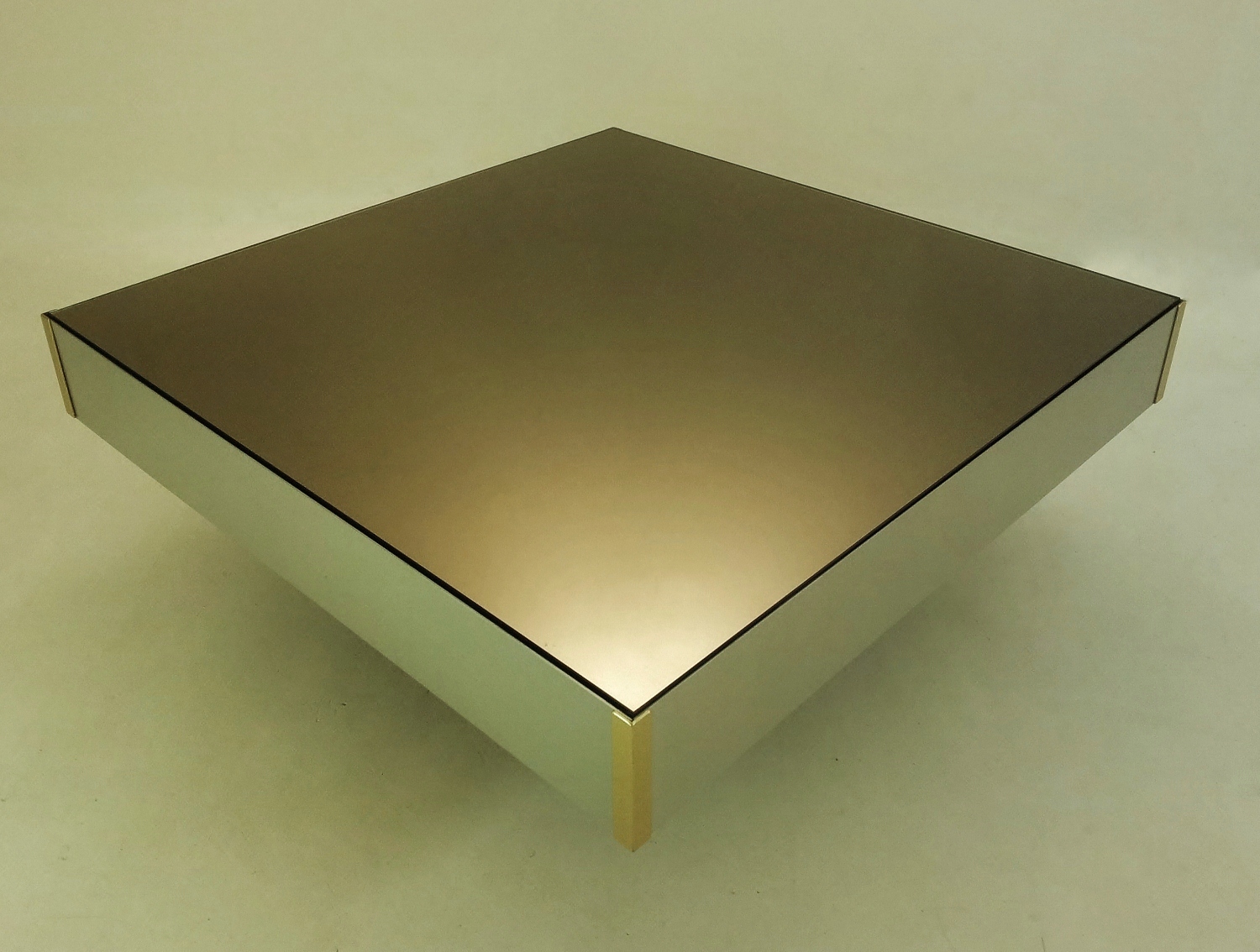 Vintage square coffee table by Cidue, 1970`s ca, Italy. Glamorous floating effect created by the original vintage copper colour mirrrored surface on the top, and the smooth aluminium sides, all reflecting the natural light. The pedestal ebonised wooden base emphasise this effect too. The corners are finished with a geometric brass detail. Good size coffee table. Very good condition all around with no chips or marks on the mirror surface.