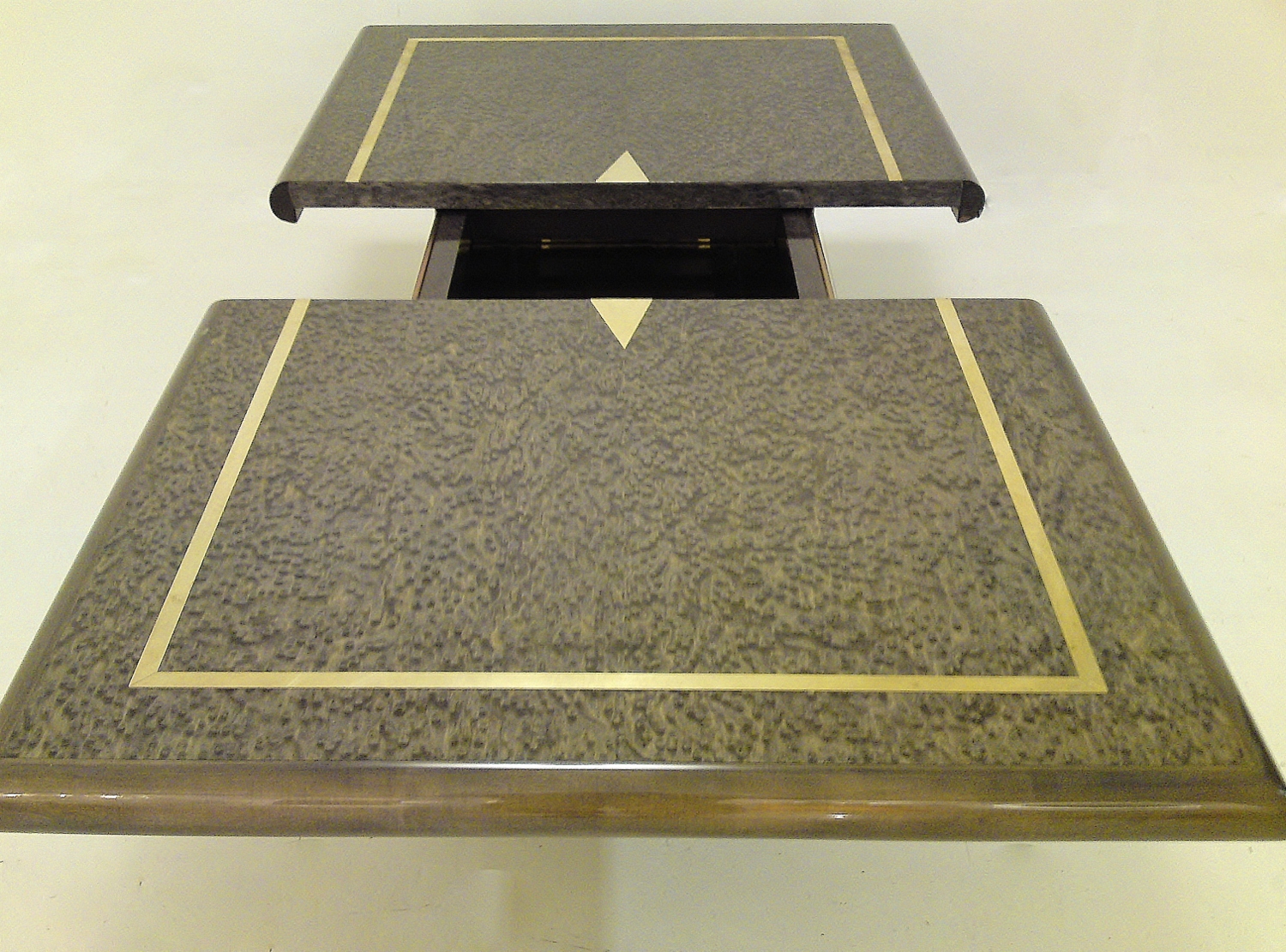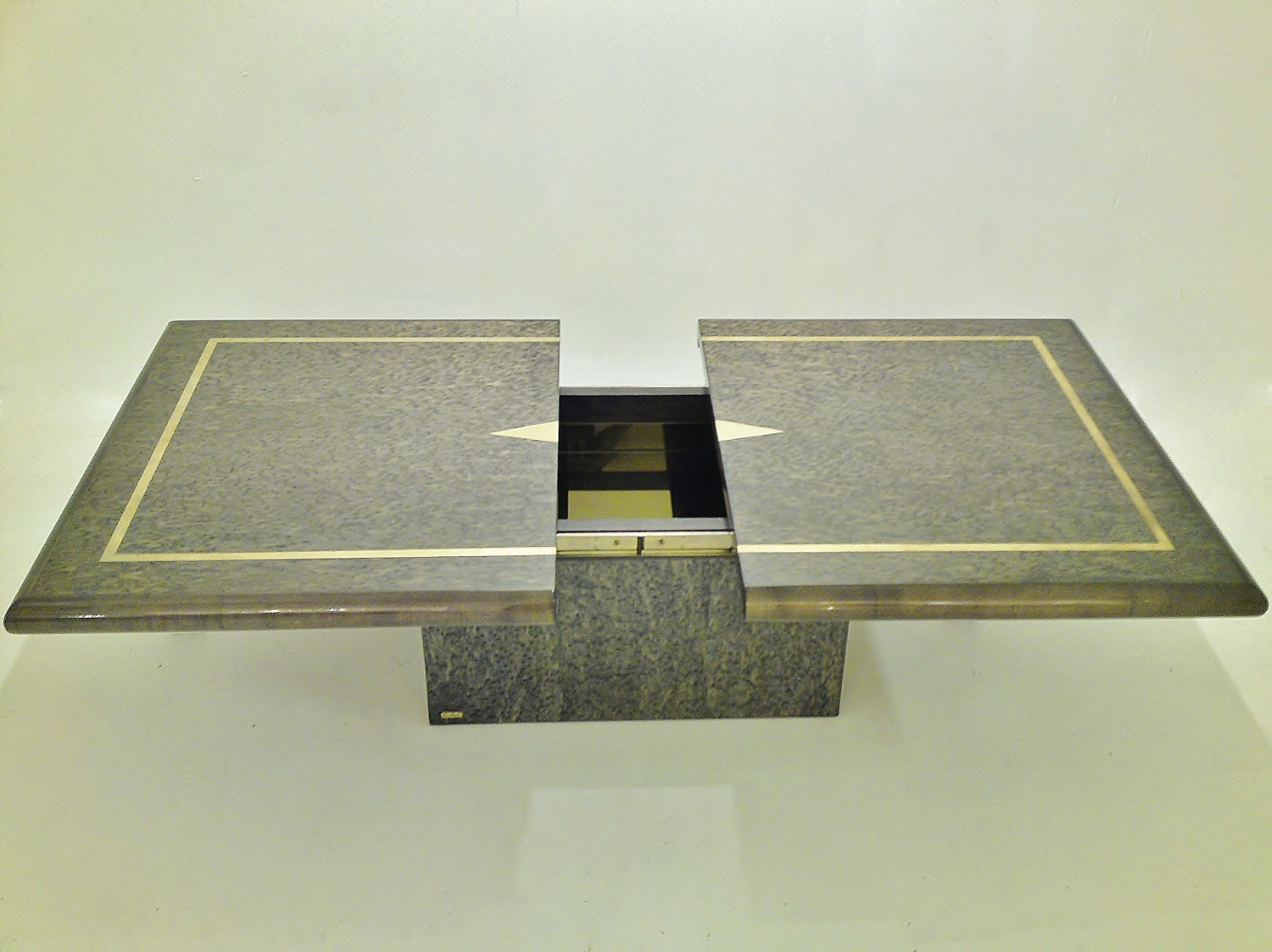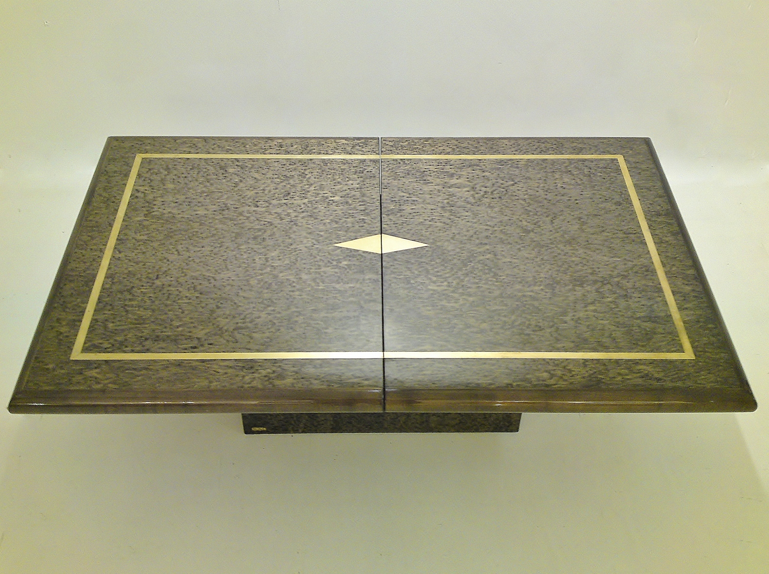Vintage extending coffee table/bar designed by Eric Maville, 1970`s ca, France. Top and pedestal base veneered with Bird`s Eye Maple wood stained in an elegant shade of green/grey. High gloss lacquered finish. Brass inlaid details create a geometric pattern around the edge and at the centre opening of the bar. The top slides open to reveal a sunken compartment for drinks, fully lined with original copper mirror. All in very good condition and some age patina. Original brass label.