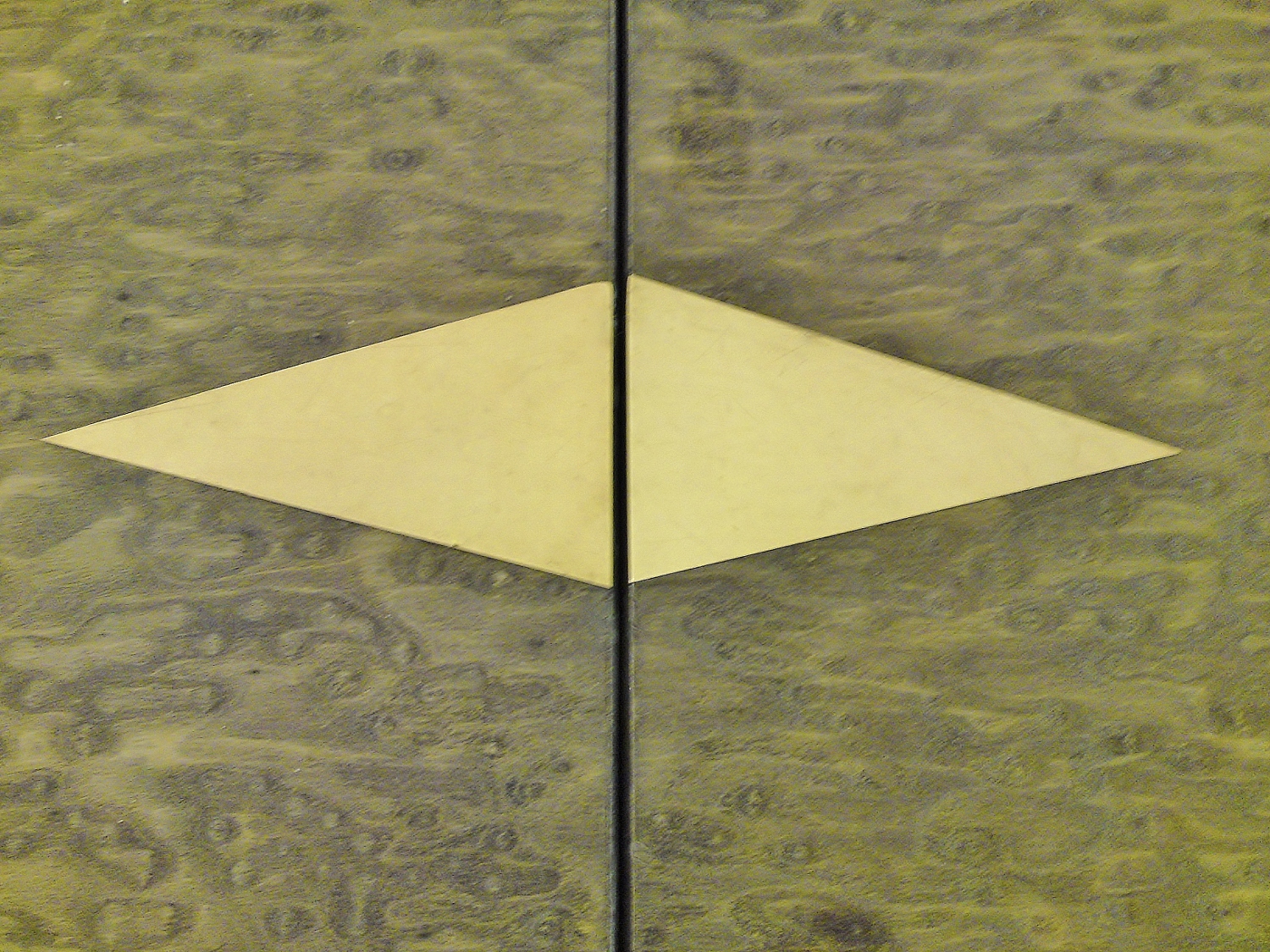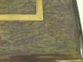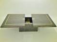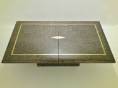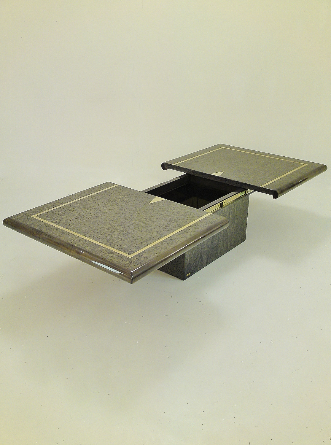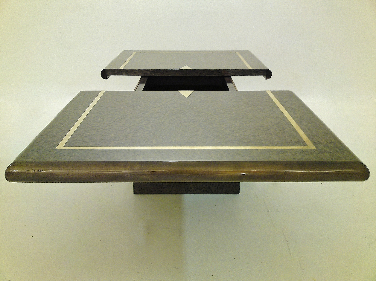 Vintage extending coffee table/bar designed by Eric Maville, 1970`s ca, France. Top and pedestal base veneered with Bird`s Eye Maple wood stained in an elegant shade of green/grey. High gloss lacquered finish. Brass inlaid details create a geometric pattern around the edge and at the centre opening of the bar. The top slides open to reveal a sunken compartment for drinks, fully lined with original copper mirror. All in very good condition and some age patina. Original brass label.