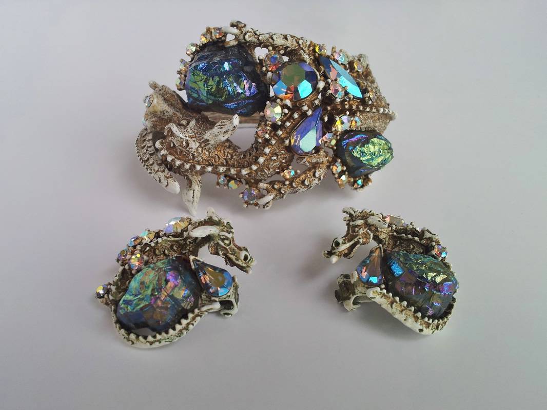 The 1959 dragon series with it’s mystical and magical fantasy is completely original. In addition the pieces are made with fine metalwork and include stones called lava rocks and aurora borealis which enhanced the exotic nature of their highly sculptural creations.