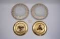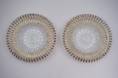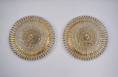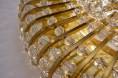 Each shade is slightly dome shaped consisting of tiny solid polished brass square section columns separated by segments of Lucite beads & tiny clear cylinder shape beads. These are strung together to make a sunburst pattern. Light passing though emphasises the depth and gold toned reflections.