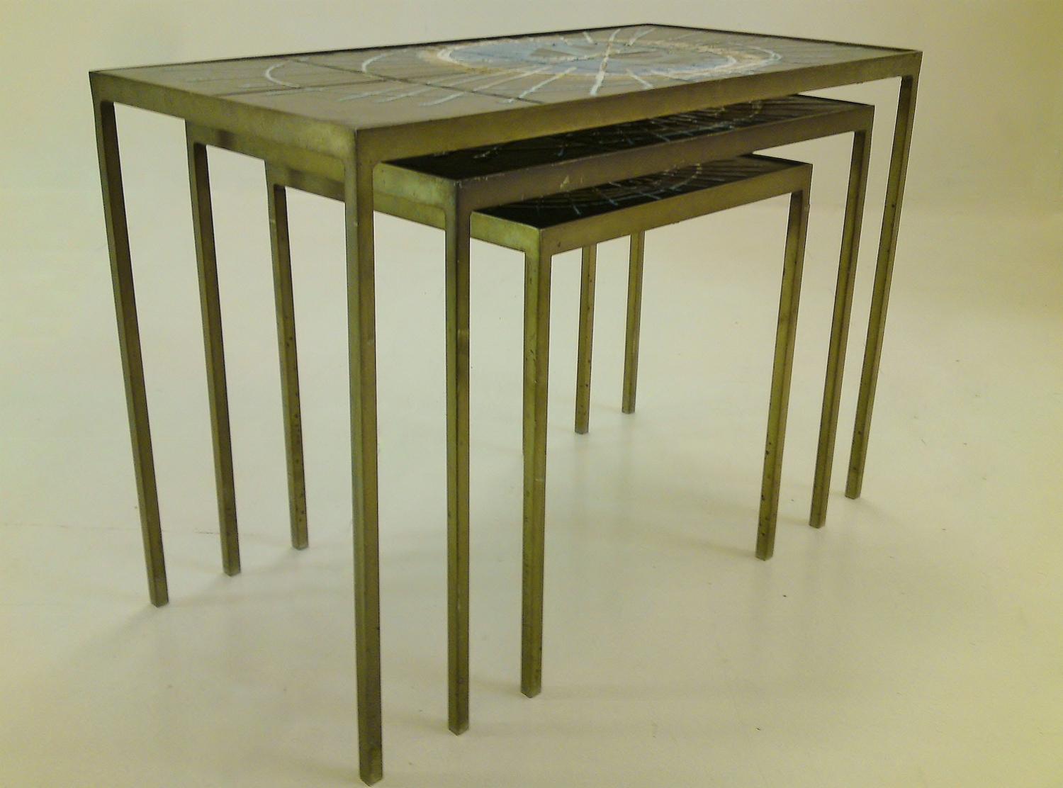 Juliette Belarti Brutalist vintage nest of three side tables, 1960`s ca, Belgium. Hand painted high temperature glazed ceramic tiles with great colour and texture. Rare example where the solid steel frames are brass plated and executed in raw, simple and brutalist inspired shapes that beautifully frame the tiles and provide stability. Each top is signed by the artist. Very good condition with nice age patina giving lots of character. The price is for the set of three.