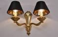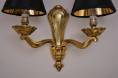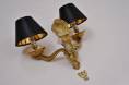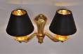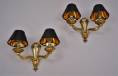 Each light is finished with a new black silk lampshade, lined in gold metallic and edged with a black fabric trim. These lampshades clip onto the candle shaped light bulbs.