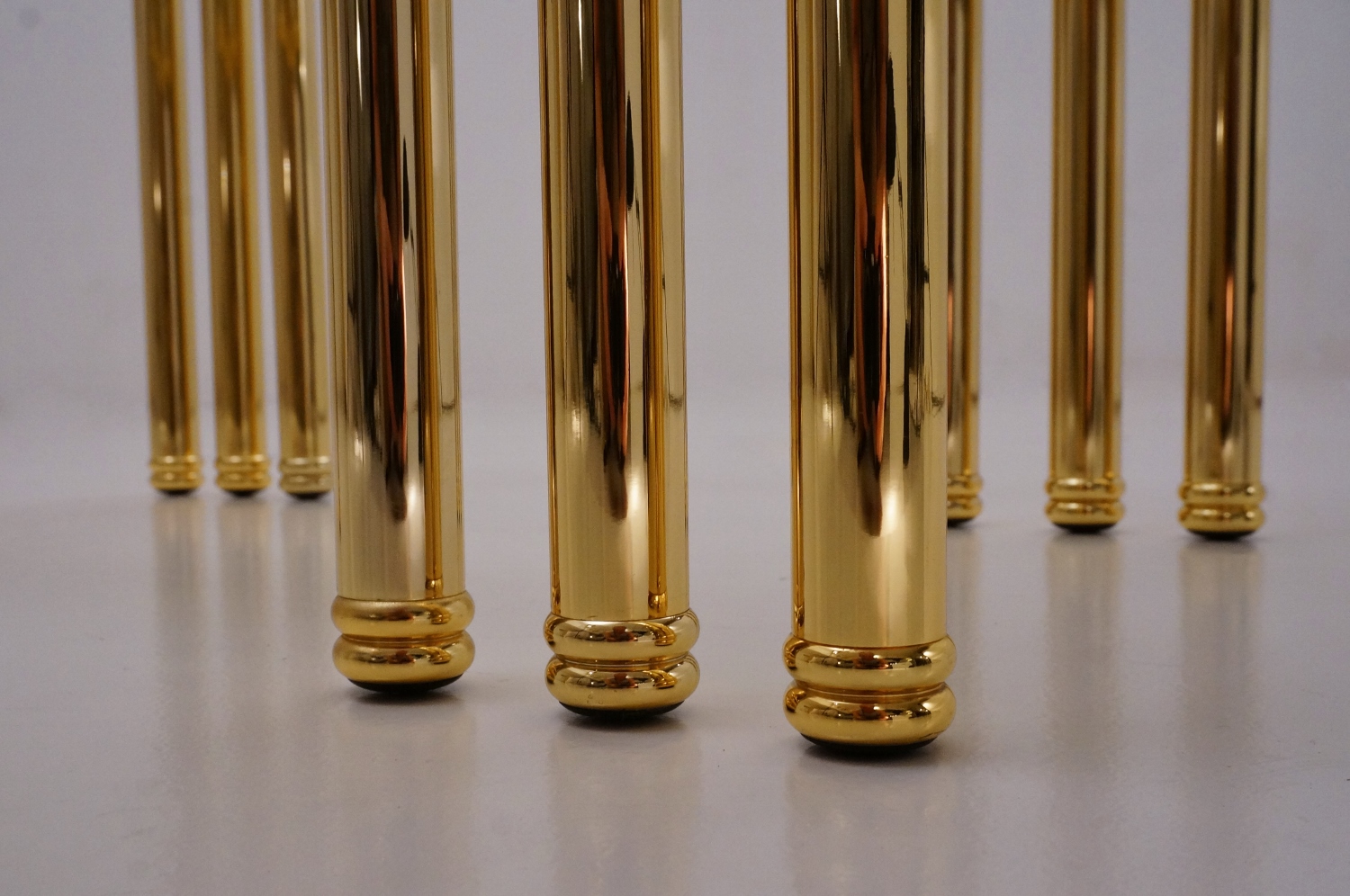 Structurally these tables have tubular column legs. These are finished at the bottom with a similar banding as at the top of the frames.The frame is a hexagonal shape with each corner finished with a unique rounded corner which softens the Minimalist design. This along with the banding gives the form a sense of `movement`.