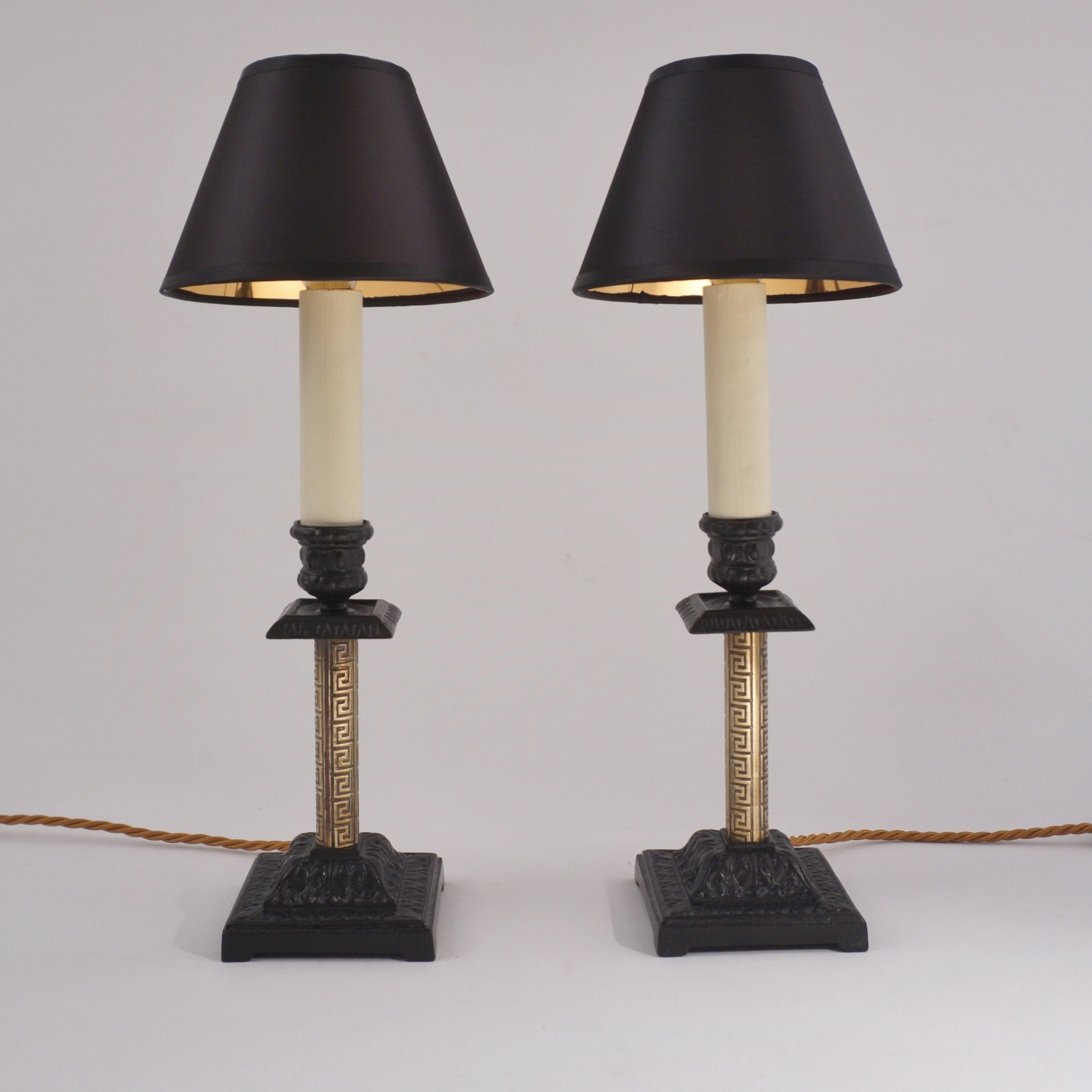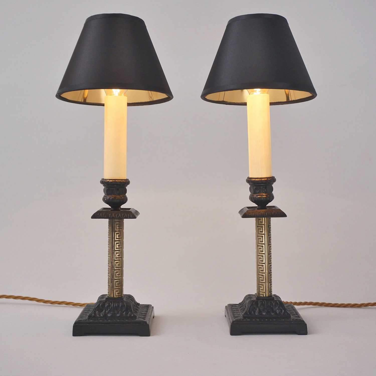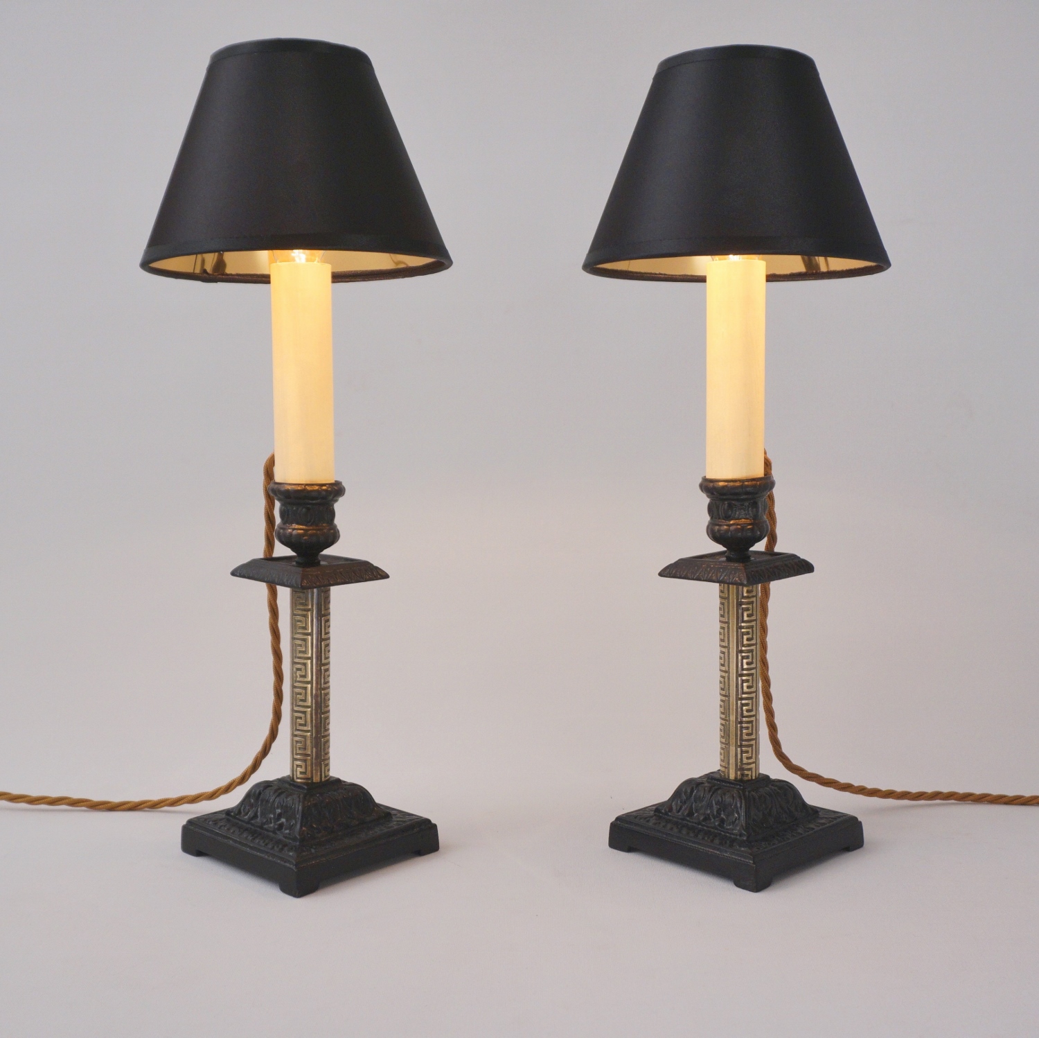 The Aesthetic Movement style flourished in Britain between 1860-1900. The sophisticated design was intended to bring beauty to everyday objects, escaping the ugliness & materialism of the Industrial Age. Aesthetic artists drew inspiration from various cultures and periods, in this example from ancient Greece, with the geometric decorative pattern on the brass. The contrast between the black & gold surfaces, tubular & square shapes, traditional & geometric motifs, make these lamps a good example of The Aesthetic Movement style. This rich eclecticism is one of the Aesthetic Movement`s most intriguing characteristics making these lamps fitting for Interiors today.