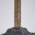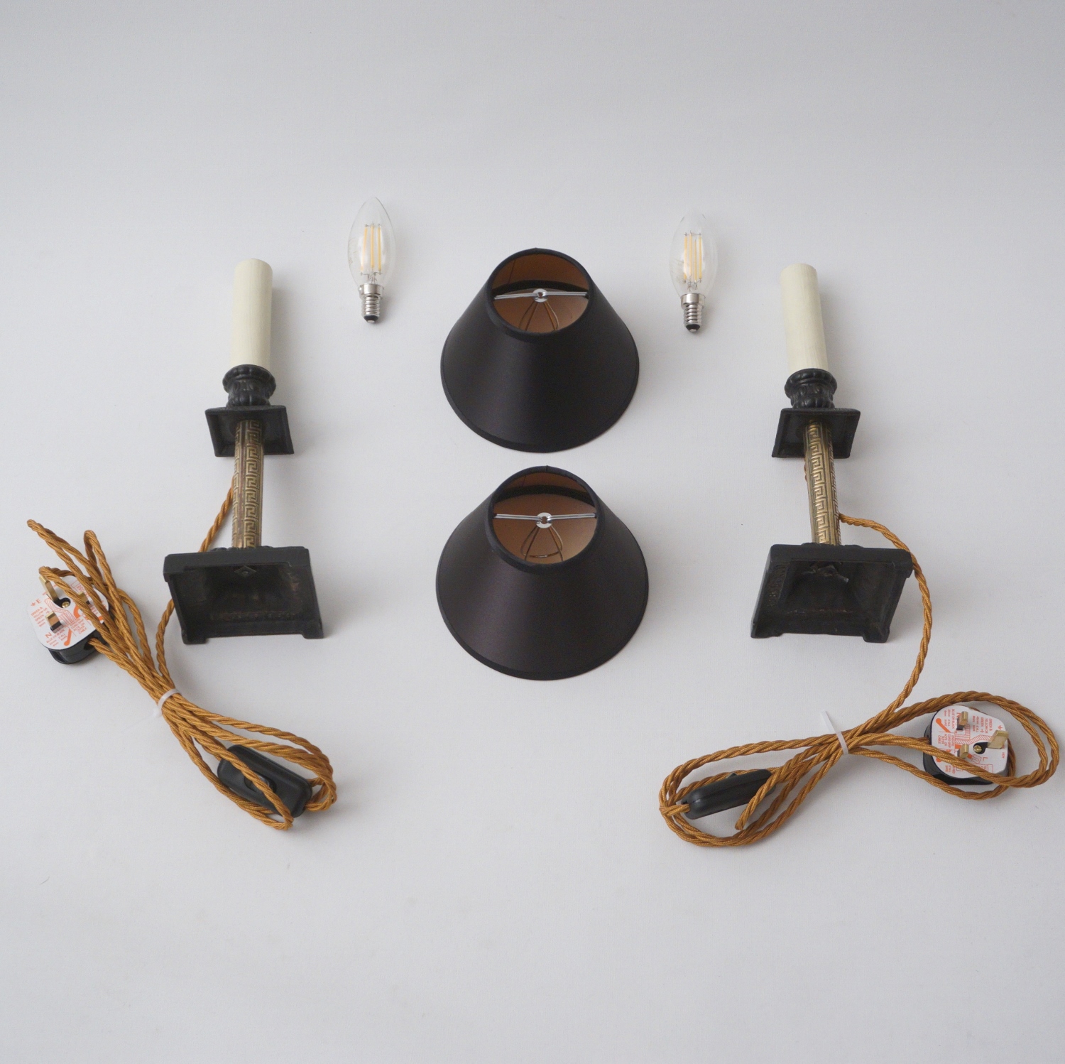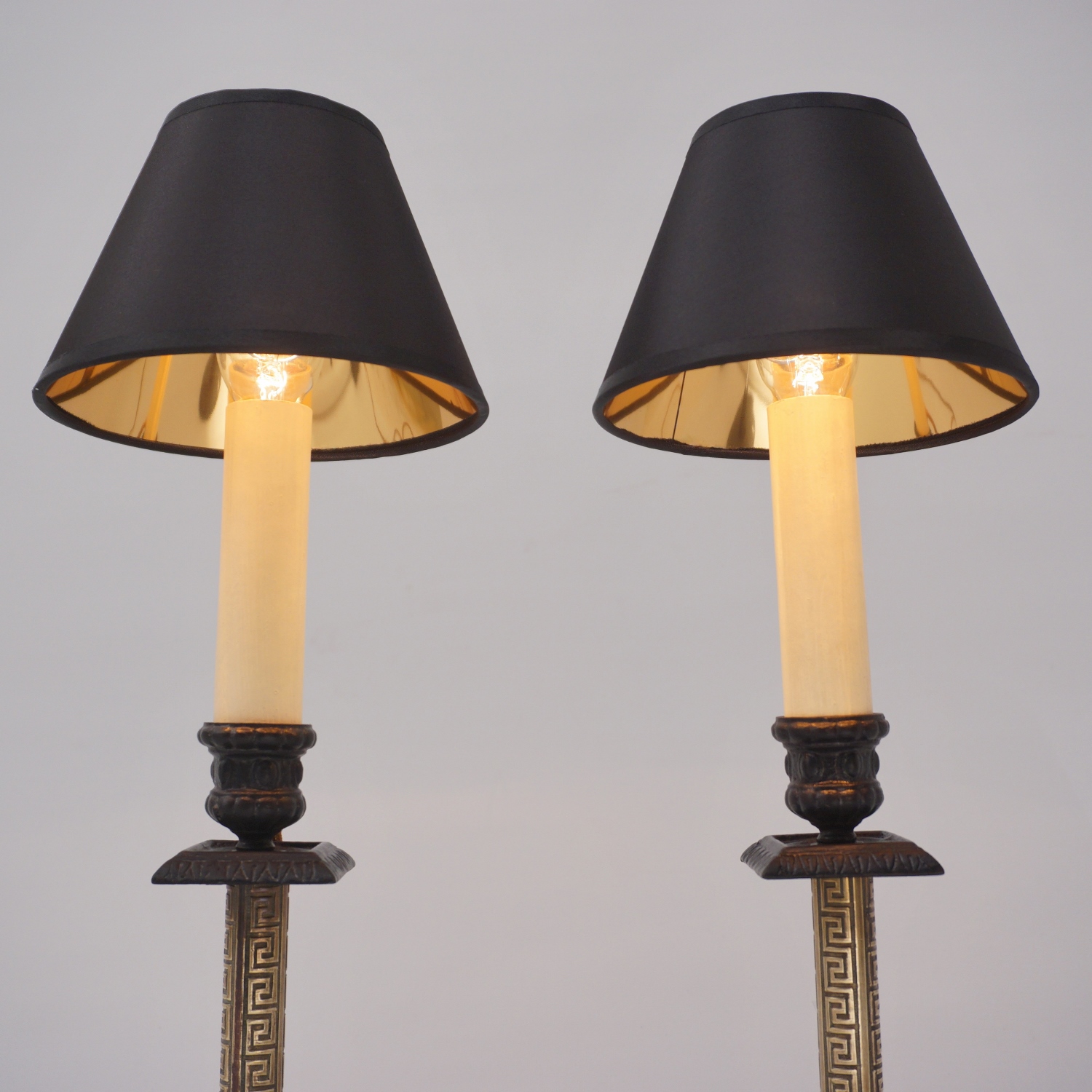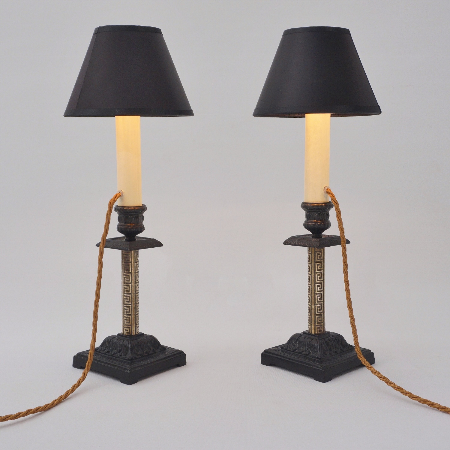 The Aesthetic Movement style flourished in Britain between 1860-1900. The sophisticated design was intended to bring beauty to everyday objects, escaping the ugliness & materialism of the Industrial Age. Aesthetic artists drew inspiration from various cultures and periods, in this example from ancient Greece, with the geometric decorative pattern on the brass. The contrast between the black & gold surfaces, tubular & square shapes, traditional & geometric motifs, make these lamps a good example of The Aesthetic Movement style. This rich eclecticism is one of the Aesthetic Movement`s most intriguing characteristics making these lamps fitting for Interiors today.