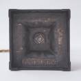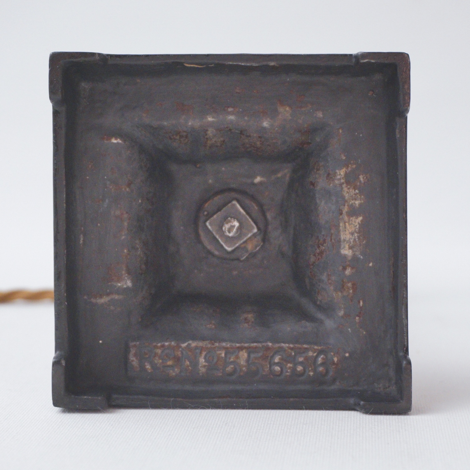Looking towards the bottom, the base is also square and in patinated iron, with a scalloped & stepped edge and four feet. A band of foliate creates movement & texture. The casting of these bands is superb. Both lamps are stamped on the underside: " R.N. 55656", the manufacturer`s registered model number.