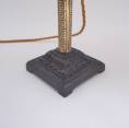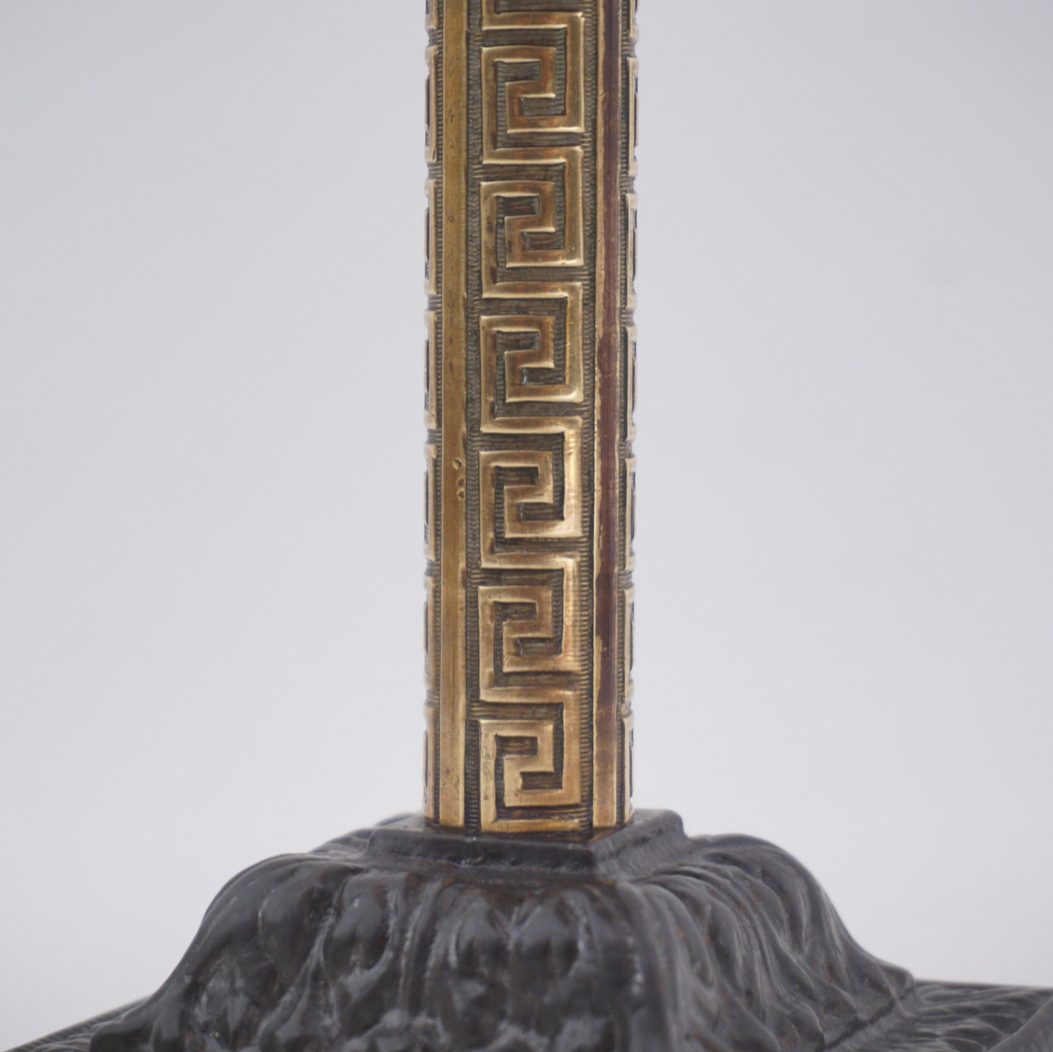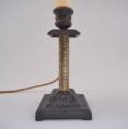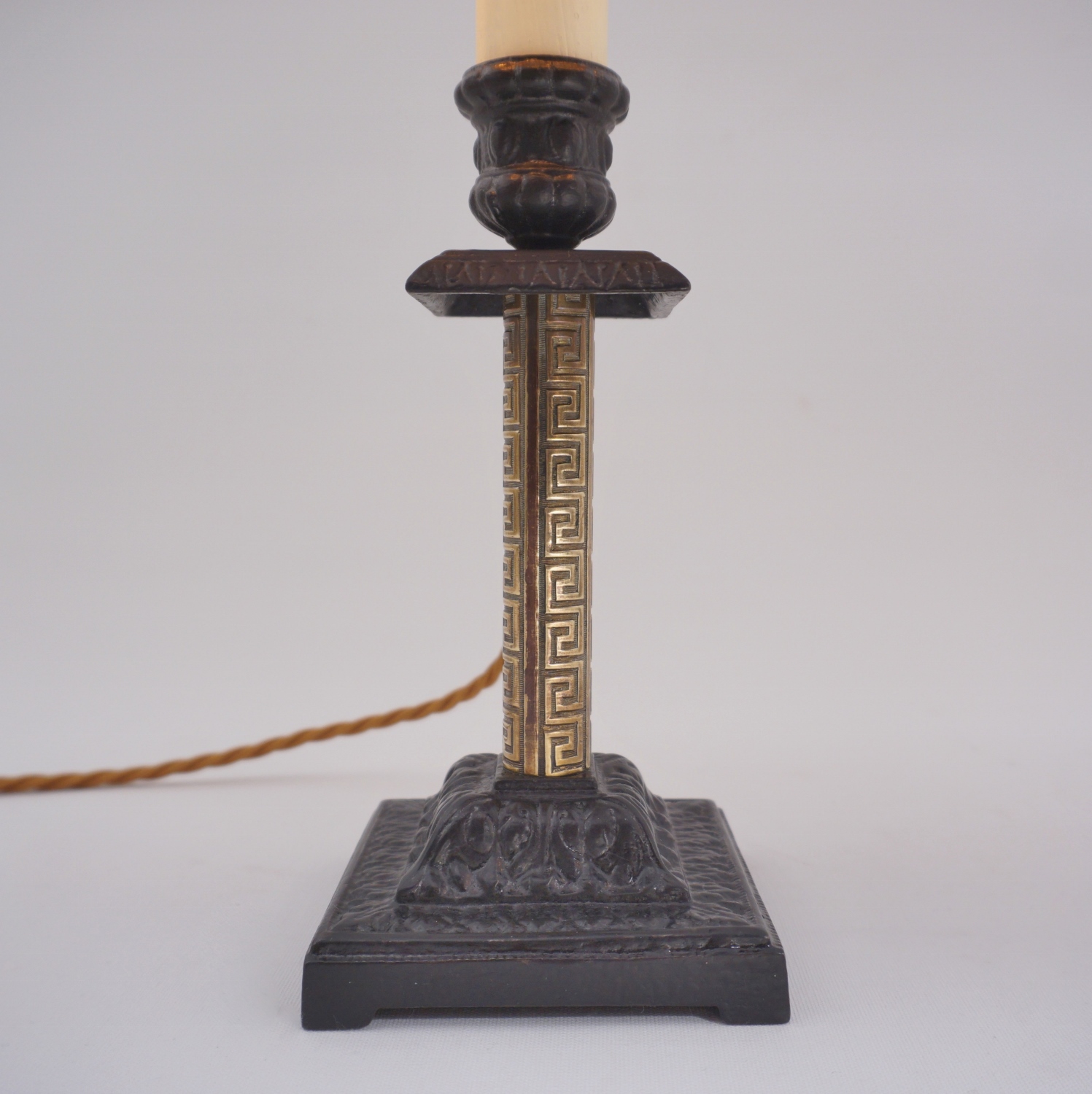 The eclectic design consists of a tubular column of polished brass with a geometric Greek key decoration. The column leads to the ornate square drip pan & sconce in patinated iron. This is followed by a new lamp holder covered by a new cream card candle tube.