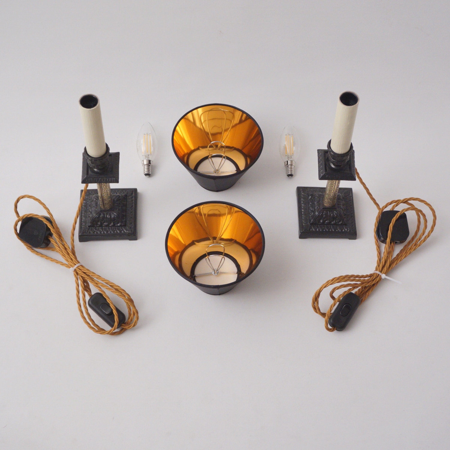 Fitted with a twisted antique gold tone silk covered cord, these lamps retain a period appropriate aesthetic while ensuring safe, modern electrification.