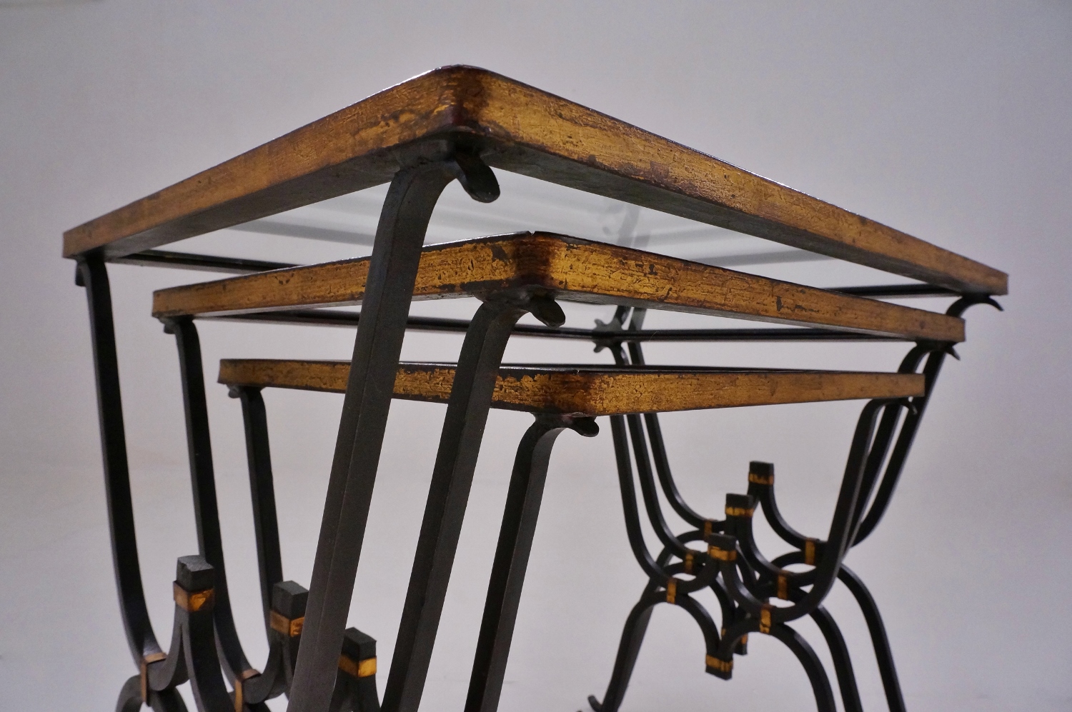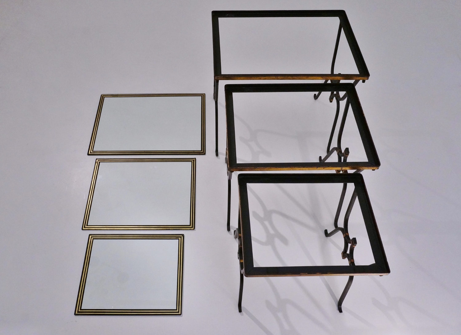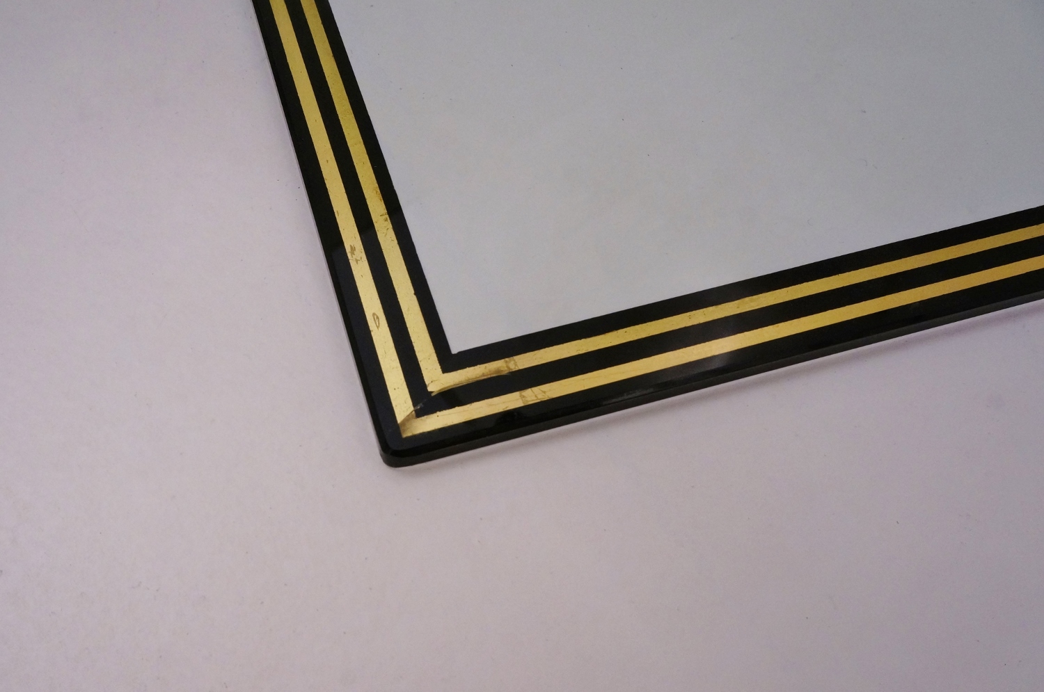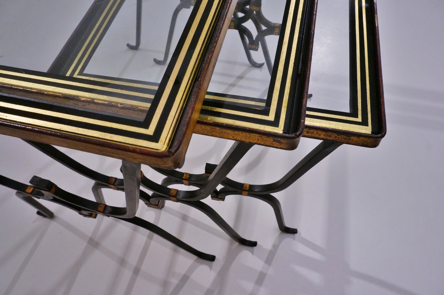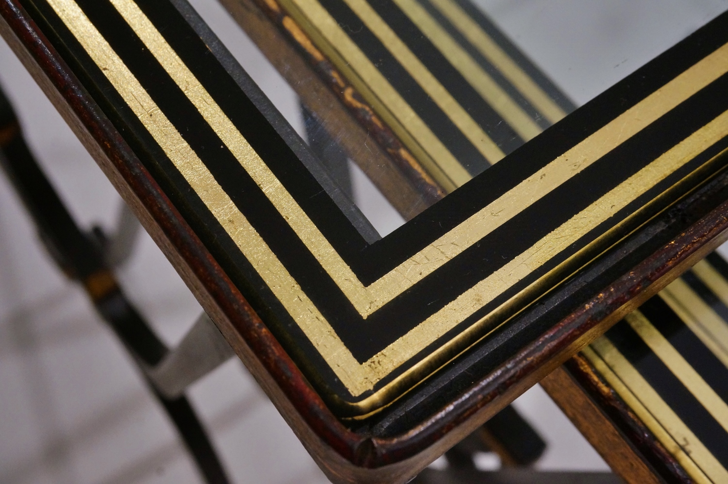 The original glass tops have an elegant painted trim on the reverse side, in black with 2 parallel lines in gold leaf tone. The