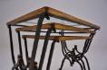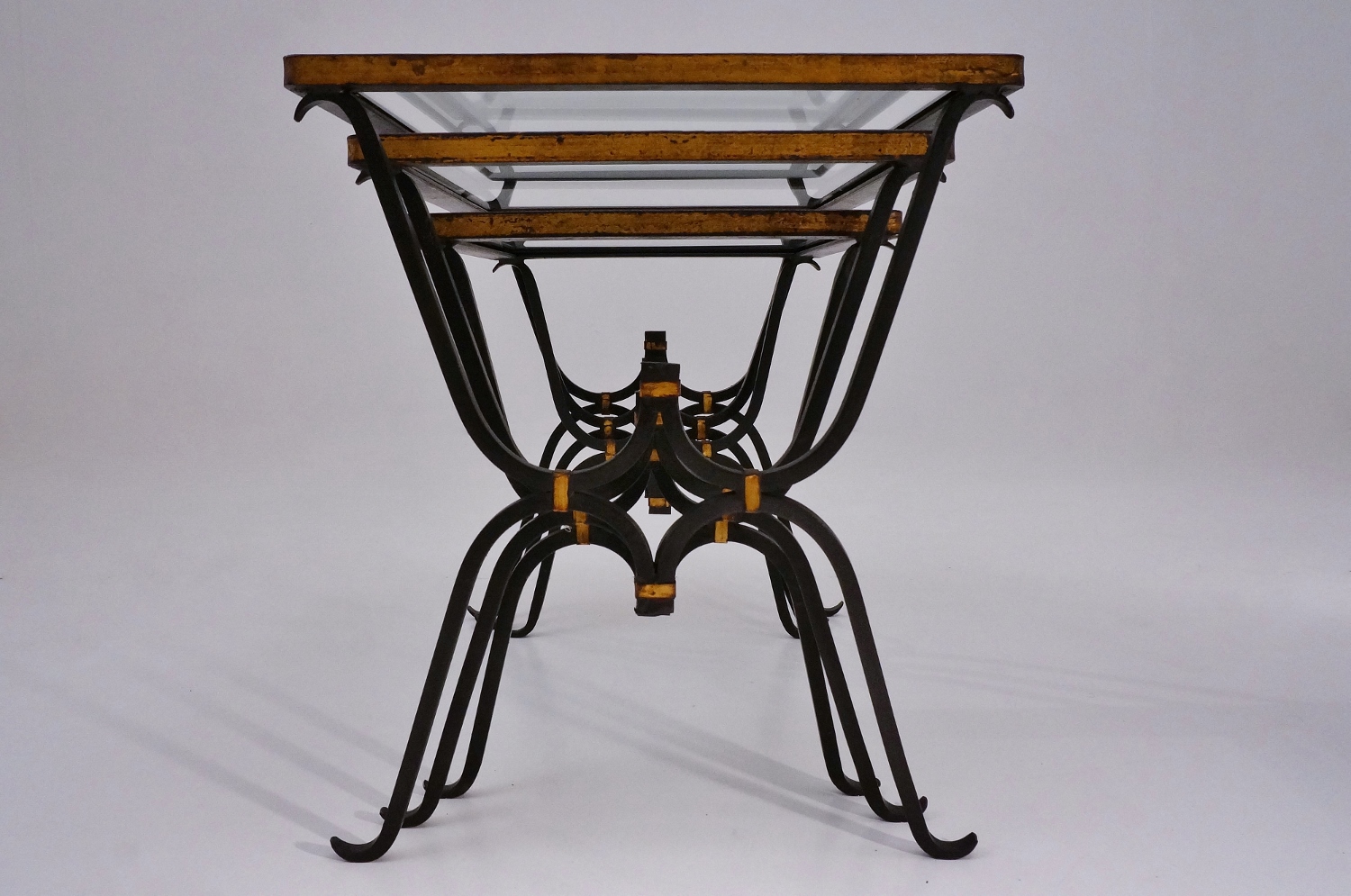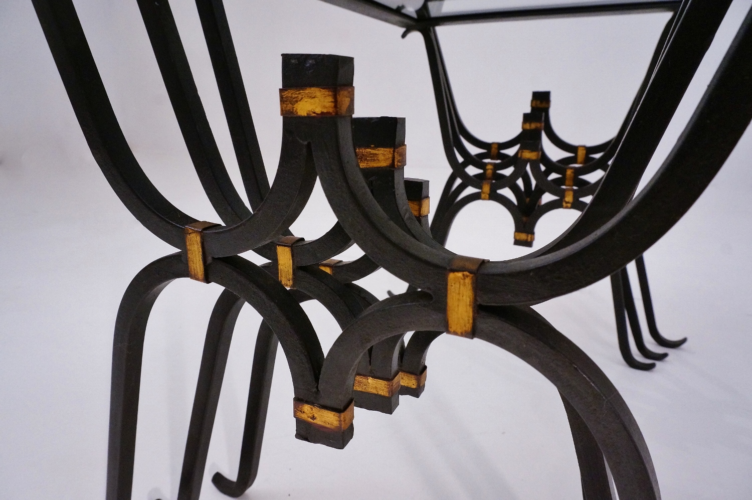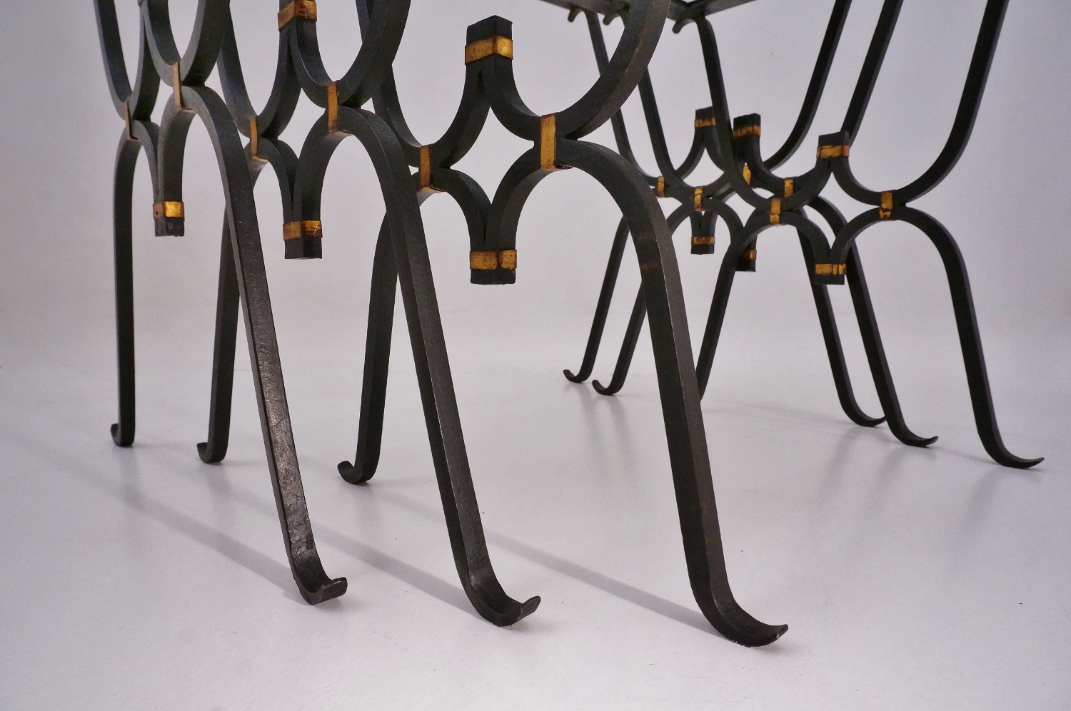 Inverted arches welded together make up the legs. The welded joints are finished with a decorate band of bronze toned foil. At the junction of the arches there are four bandings which create a cross-like pattern.