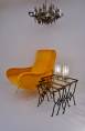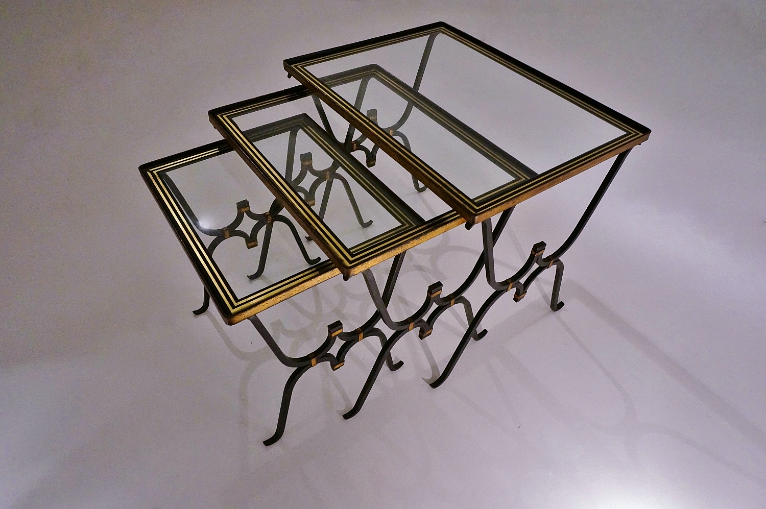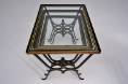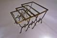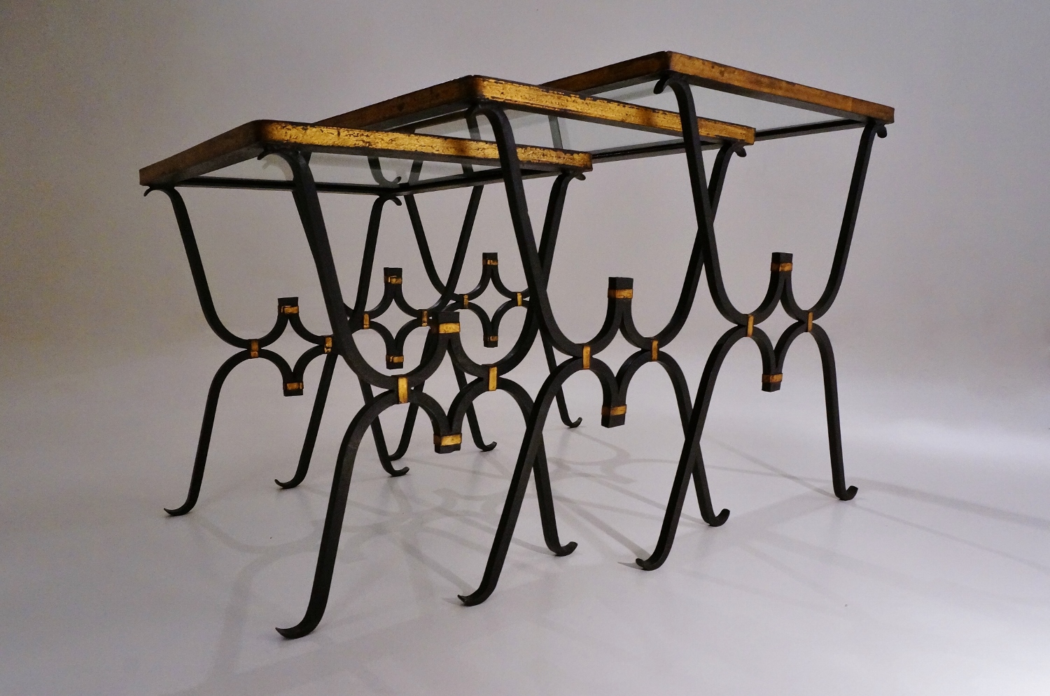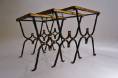 These tables are in the style of Rene Drouet. The hand forged iron frames, bronze accents and the playful `light` design with sinusoidal curves are similar to the designs by Rene Drouet.