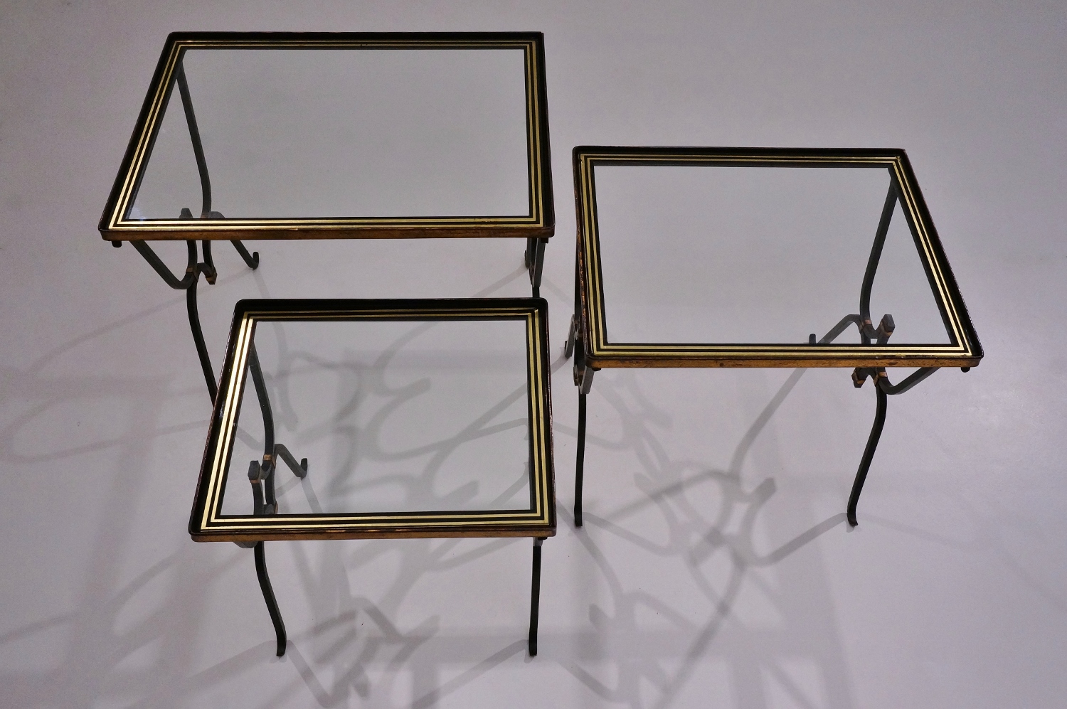 The frames are stable and in very good condition with all the bronze foil decorations intact. The glass tops are original and in good condition with only a few minor chips
