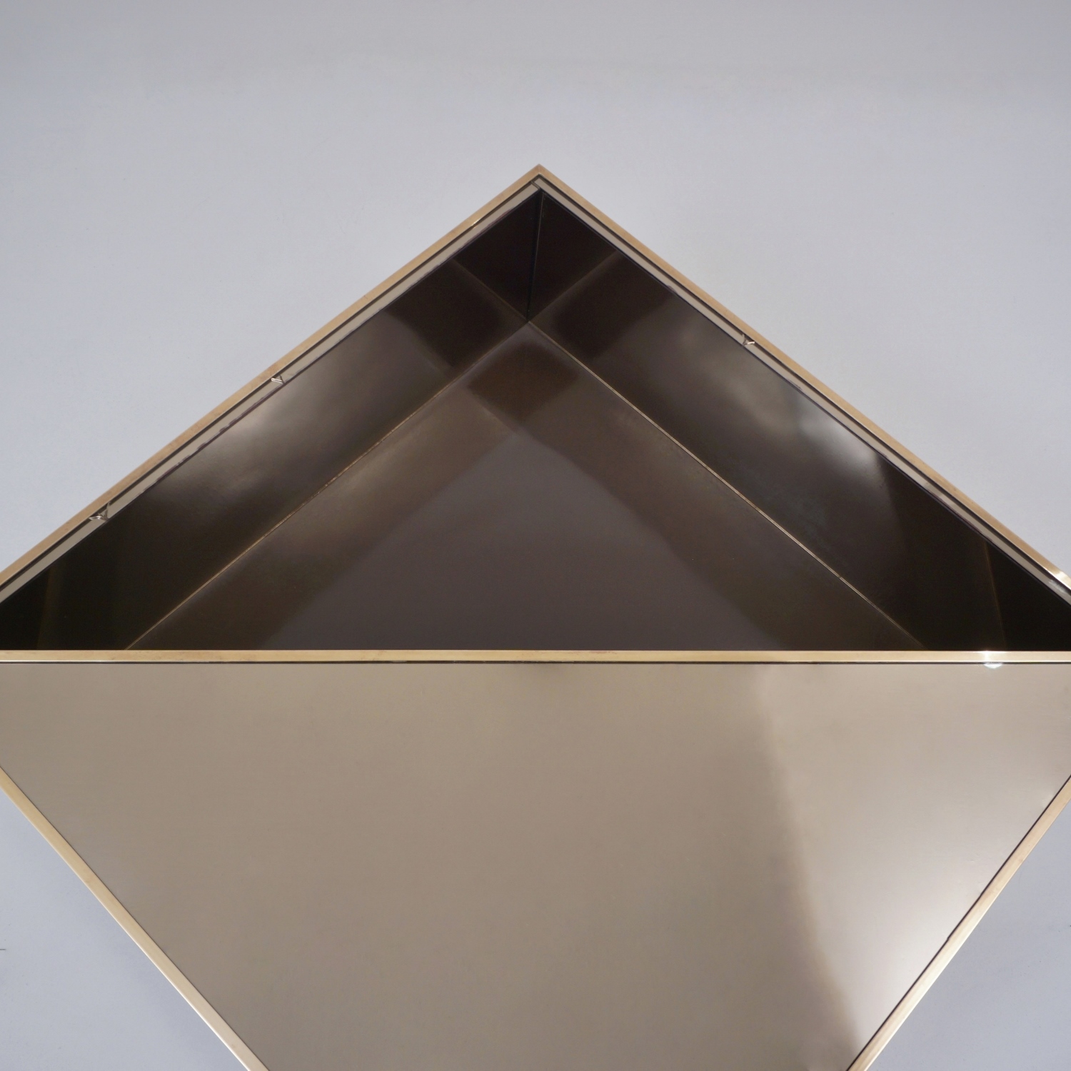 The top has bronze mirror. It is geometrically divided in the middle into two triangular sections separated with polished brass trim. The brass trim is only along the top horizontal angles, leaving the other corners `mirror to mirror` to create an illusion of lightness & reflections.