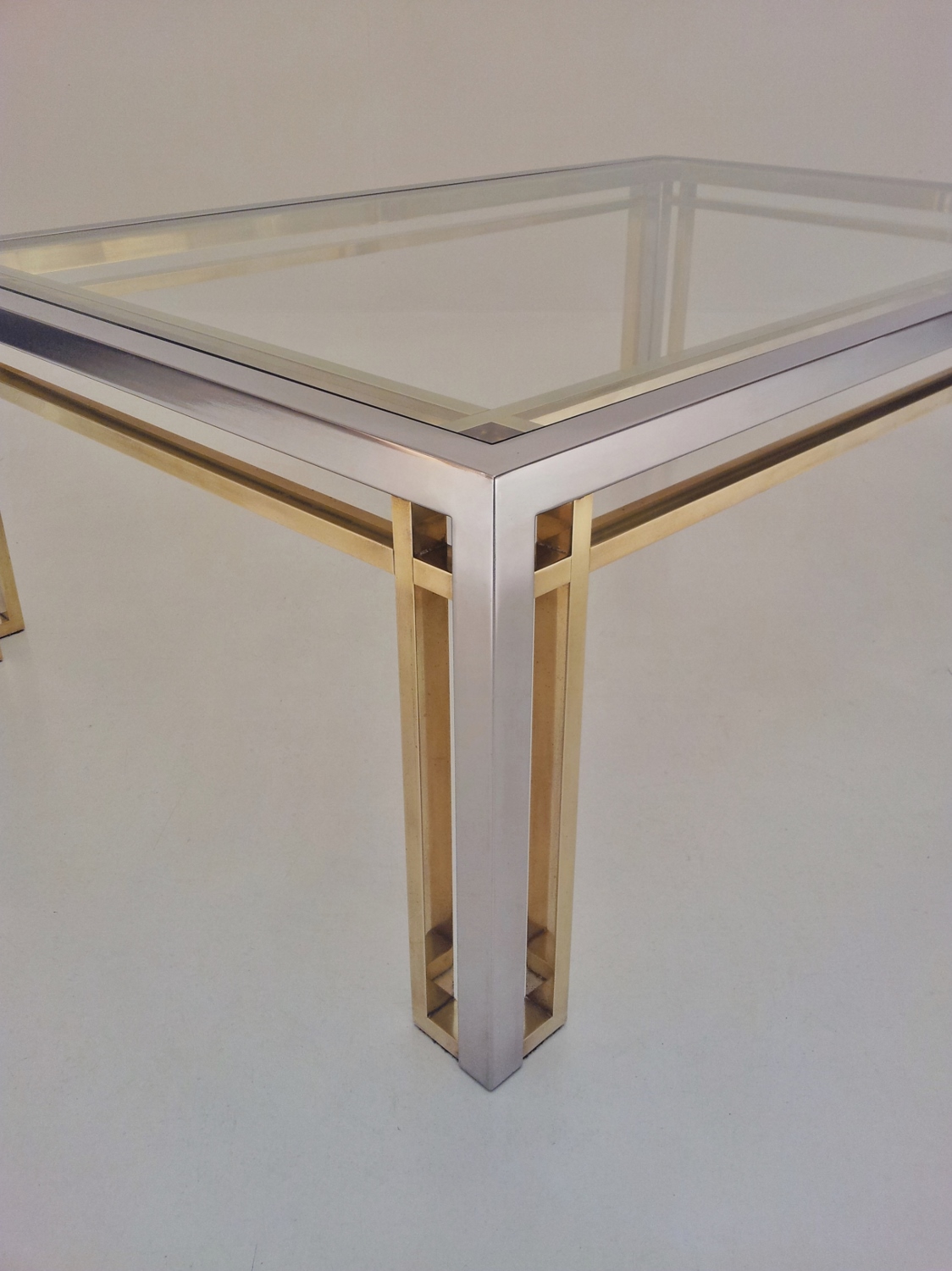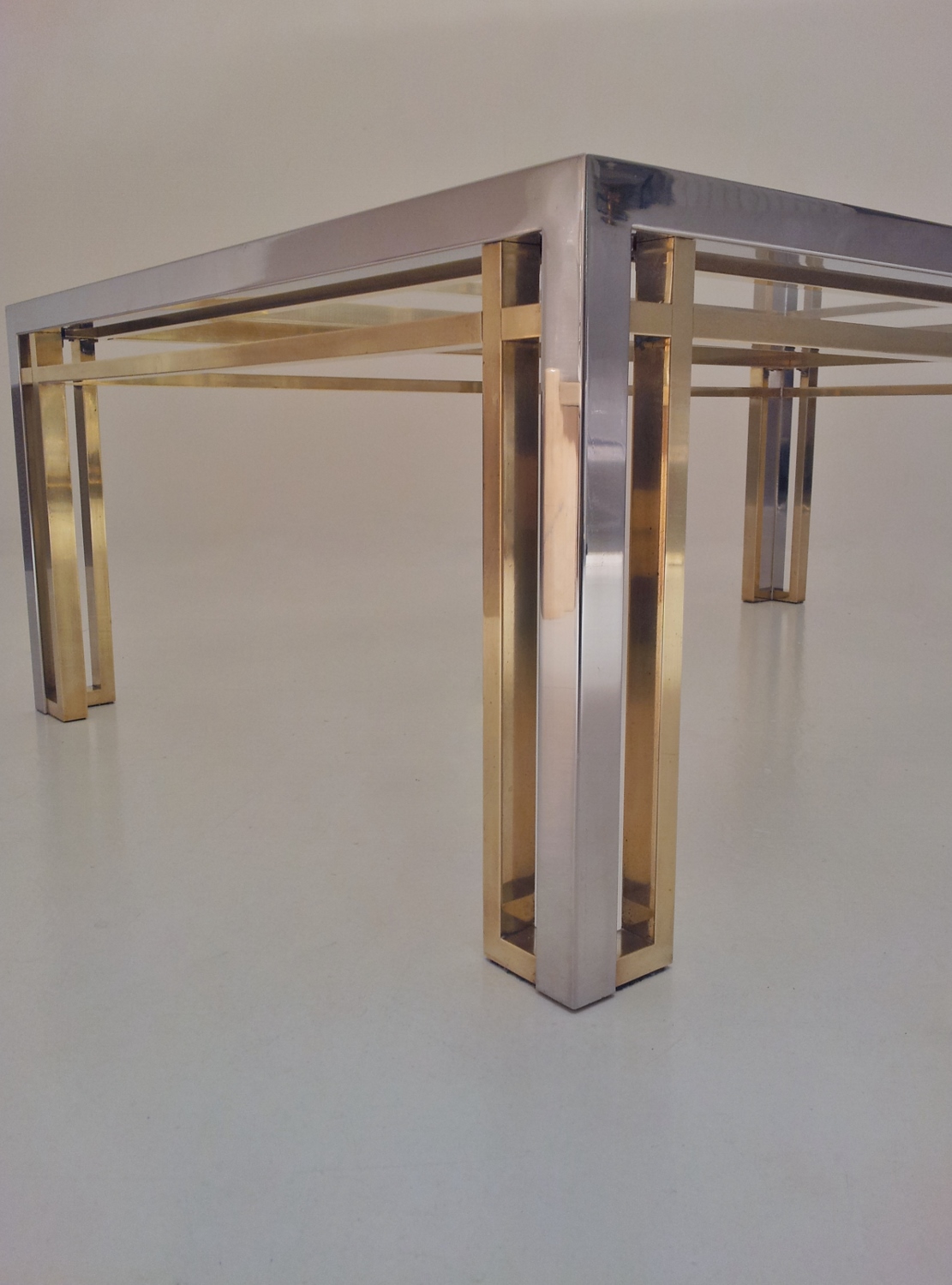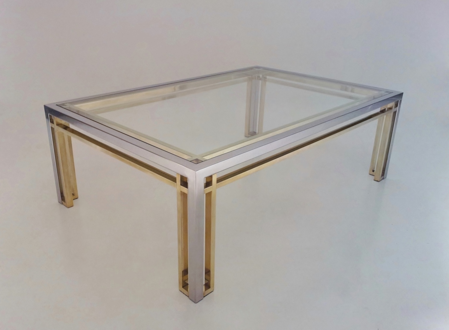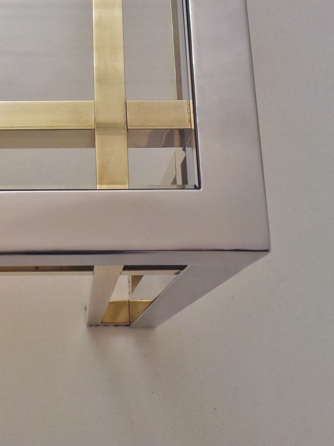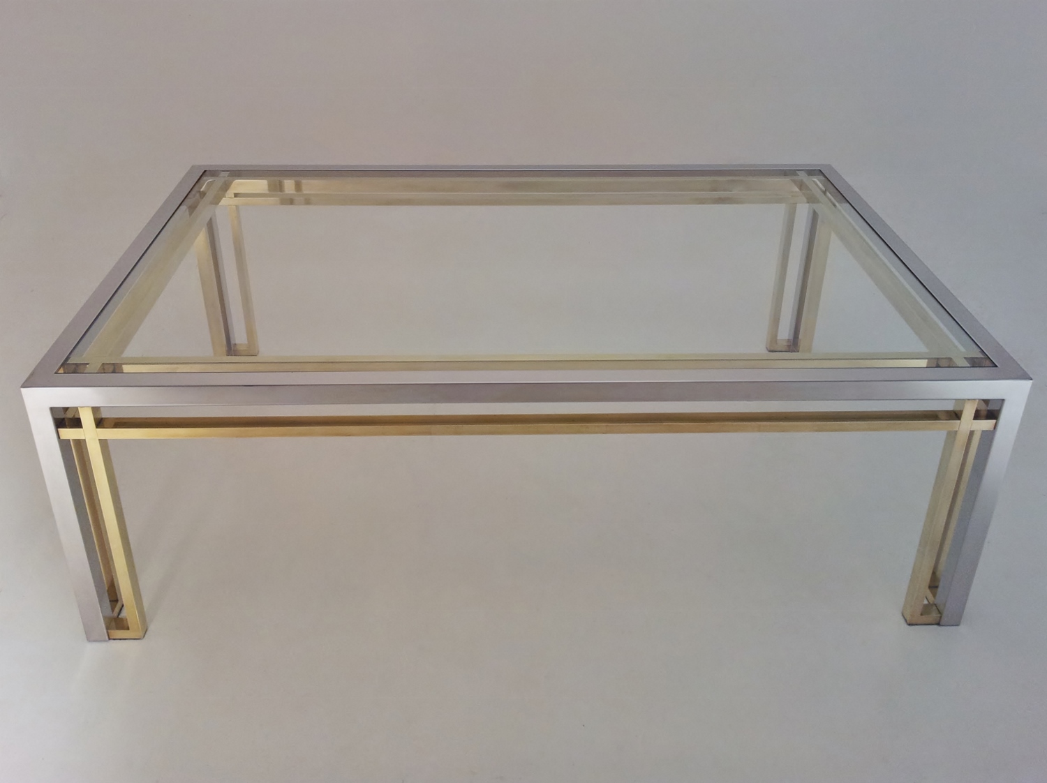 Romeo Rega table, chrome, brass & glass 1970`s ca, Italian. This 1970`s coffee table by Romeo Rega (attributed) has a large quality chrome & brass rectangular frame with cross frame interlocking detail. The original clear glass sits on the chrome & brass frame. In 1981 the company ceased production making original pieces such this 1970`s Romeo Rega coffee table rare and very valuable today. Very good original vintage condition with a nice patina on the frame. No cracks or chips on the glass surfaces. In stock at Roomscape in addition to this