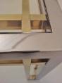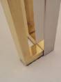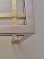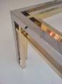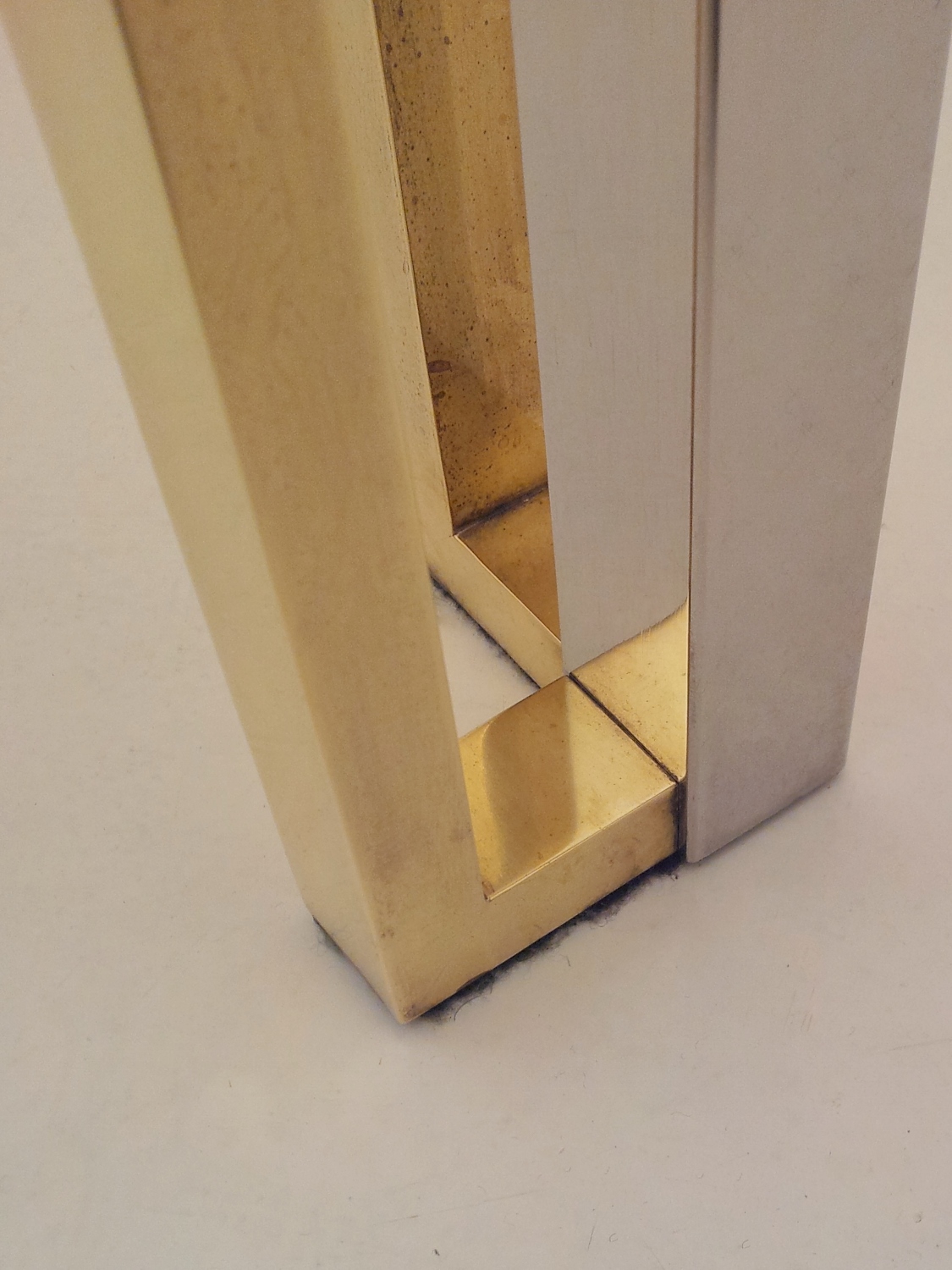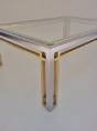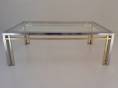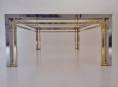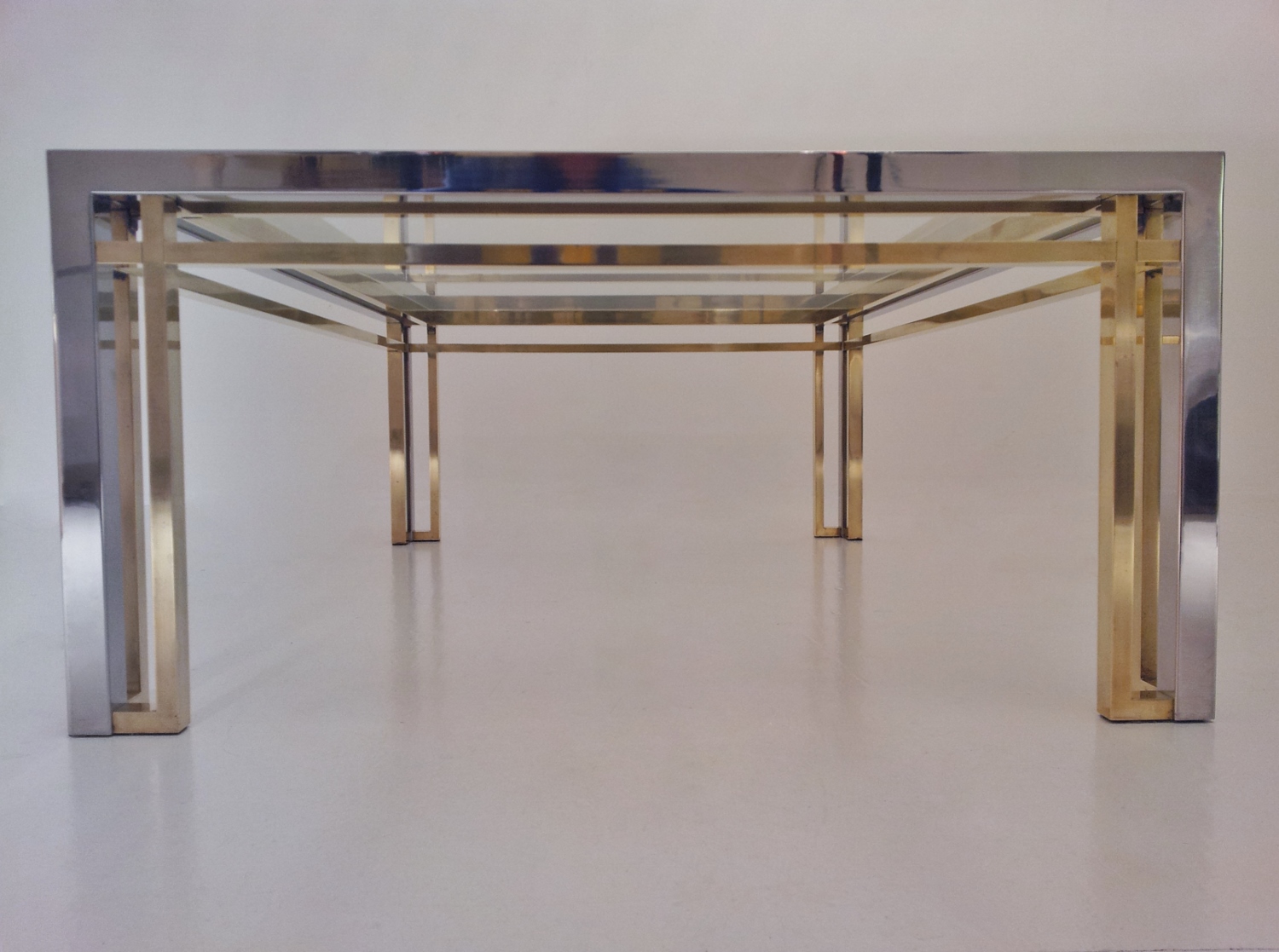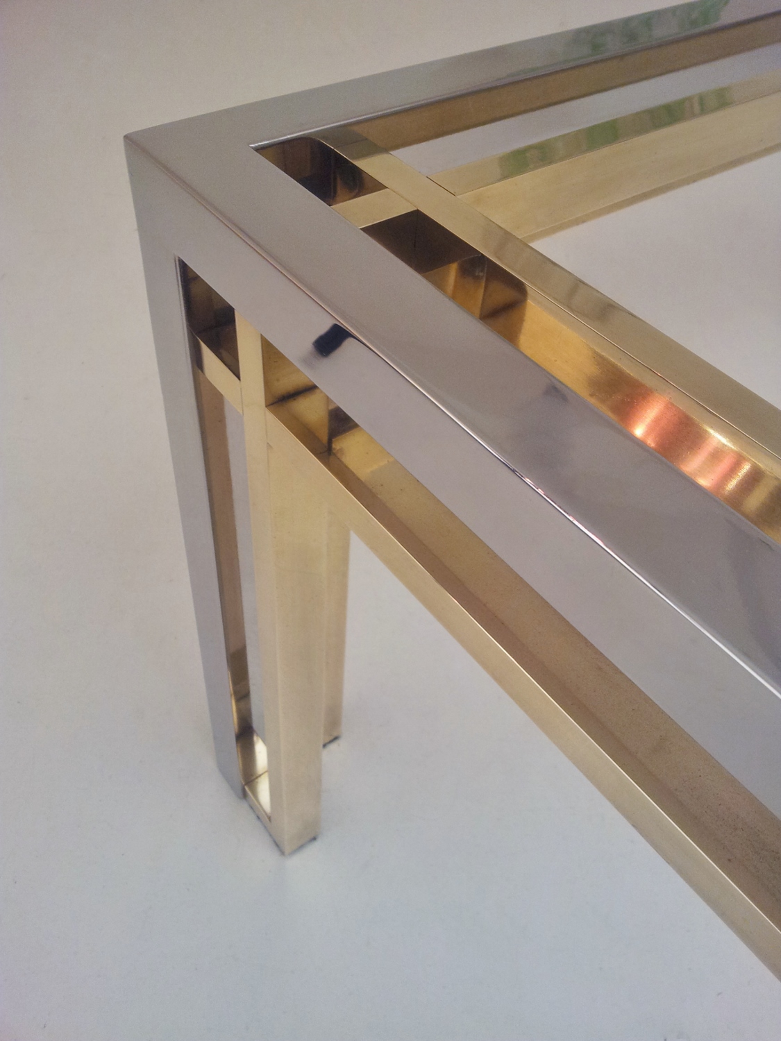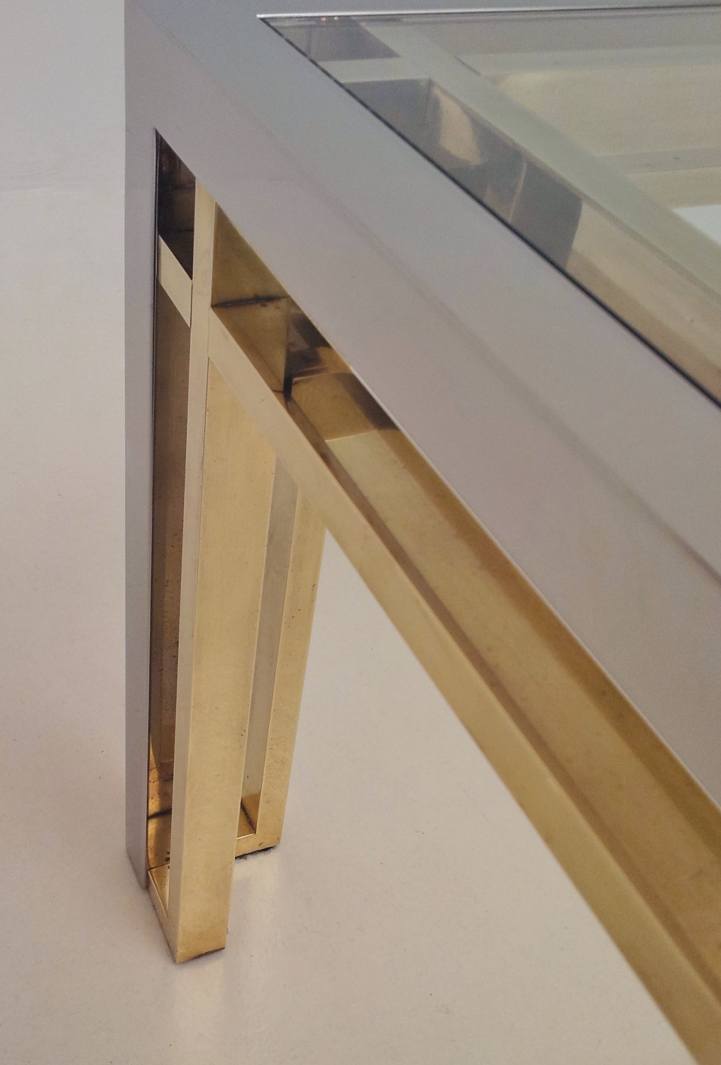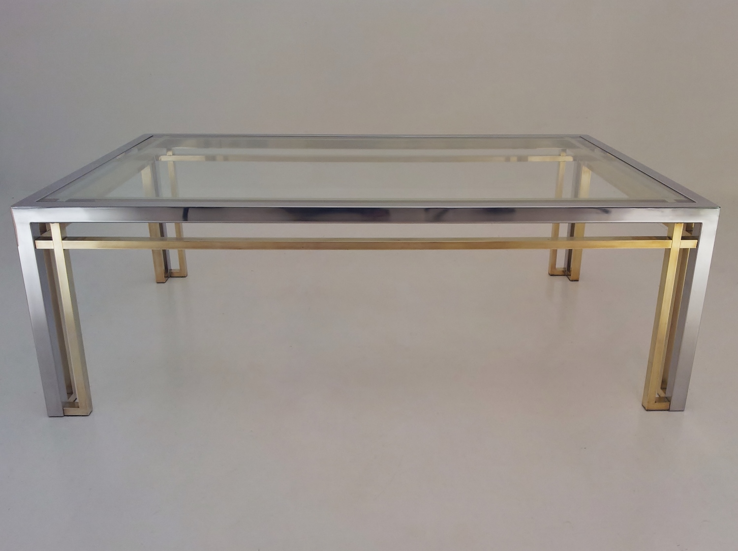 Romeo Rega table, chrome, brass & glass 1970`s ca, Italian. This 1970`s coffee table by Romeo Rega (attributed) has a large quality chrome & brass rectangular frame with cross frame interlocking detail. The original clear glass sits on the chrome & brass frame. In 1981 the company ceased production making original pieces such this 1970`s Romeo Rega coffee table rare and very valuable today. Very good original vintage condition with a nice patina on the frame. No cracks or chips on the glass surfaces. In stock at Roomscape in addition to this