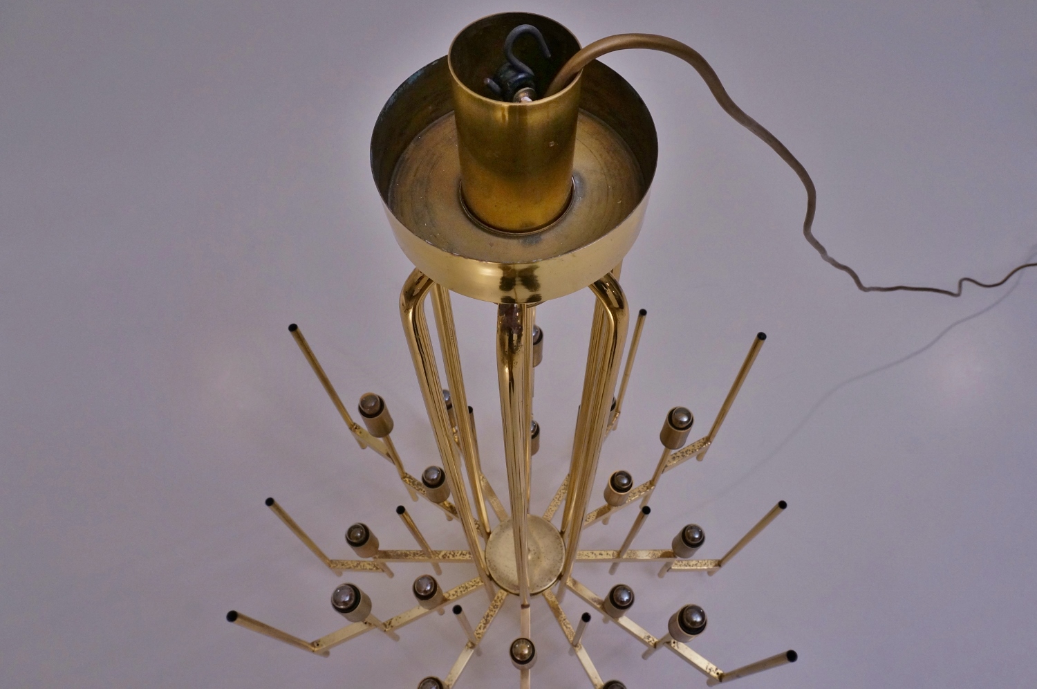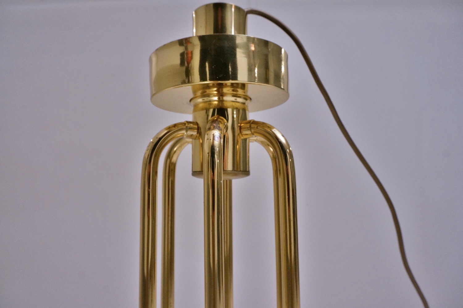 From a central brass column at the top of the piece, fall 6 brass arched tubes held together at the bottom in a brass `wheel-shaped` pattern. At this point an arm extends outwards from the vertical tube. These 6 arms have 2