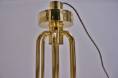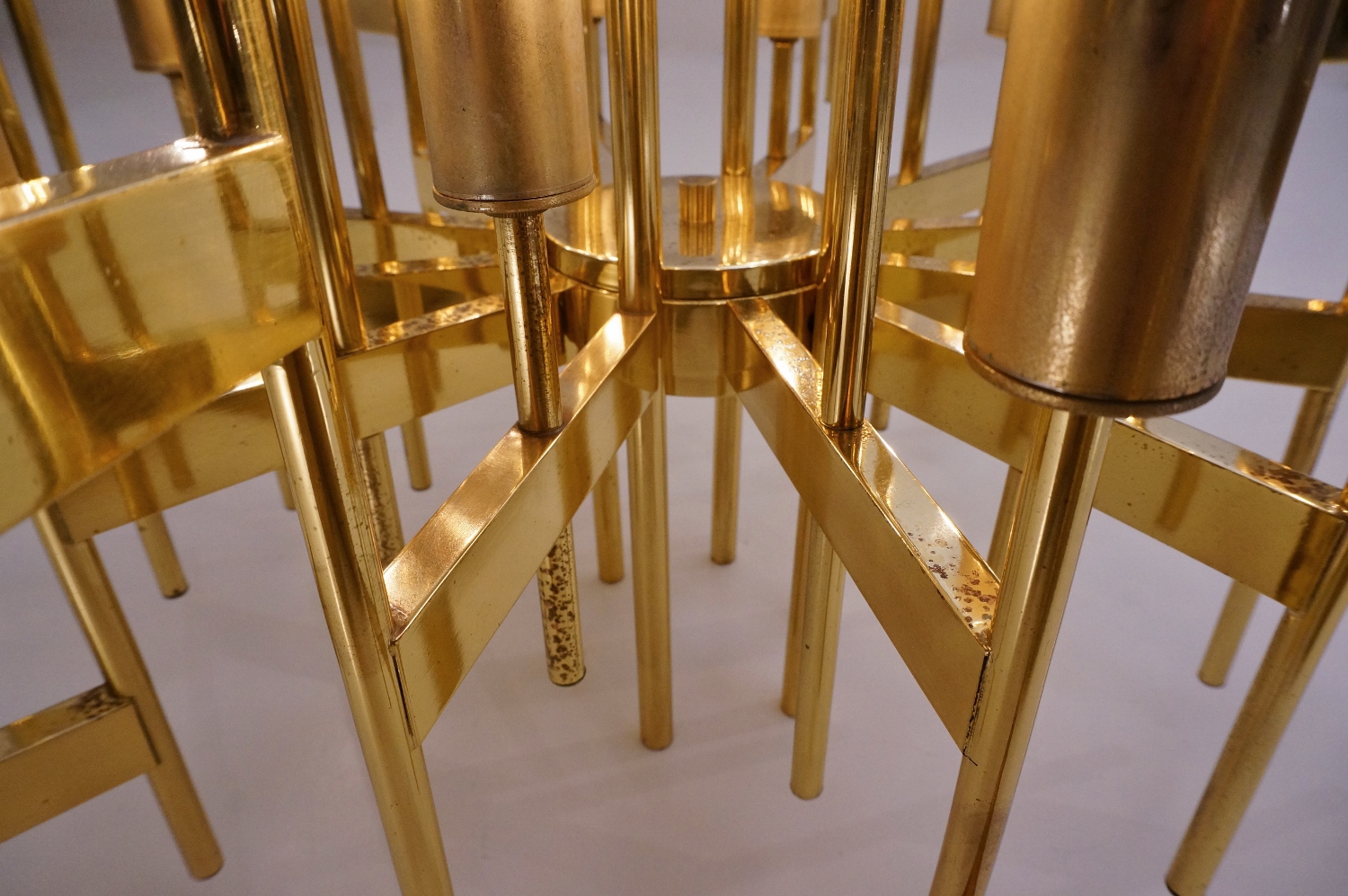 Two solid polished brass horizontal surfaces join the vertical tubular rods in each arm. The external one is slightly shorter than the central one thereby creating two inverted tiers with depth and interesting reflections. Alternating verticals rods stand like