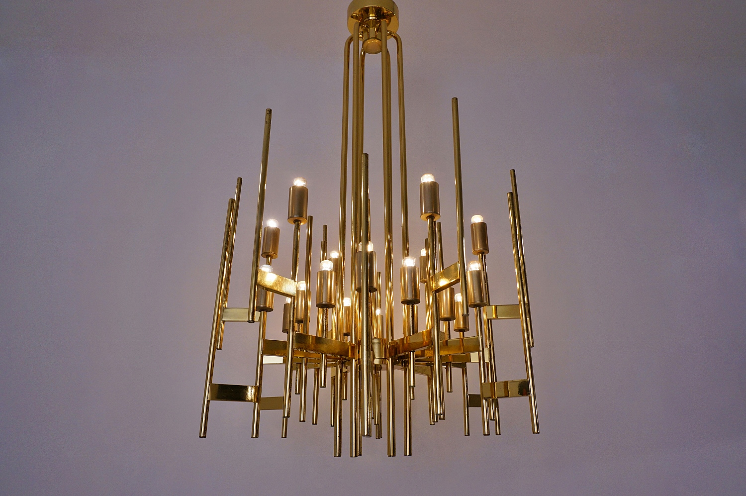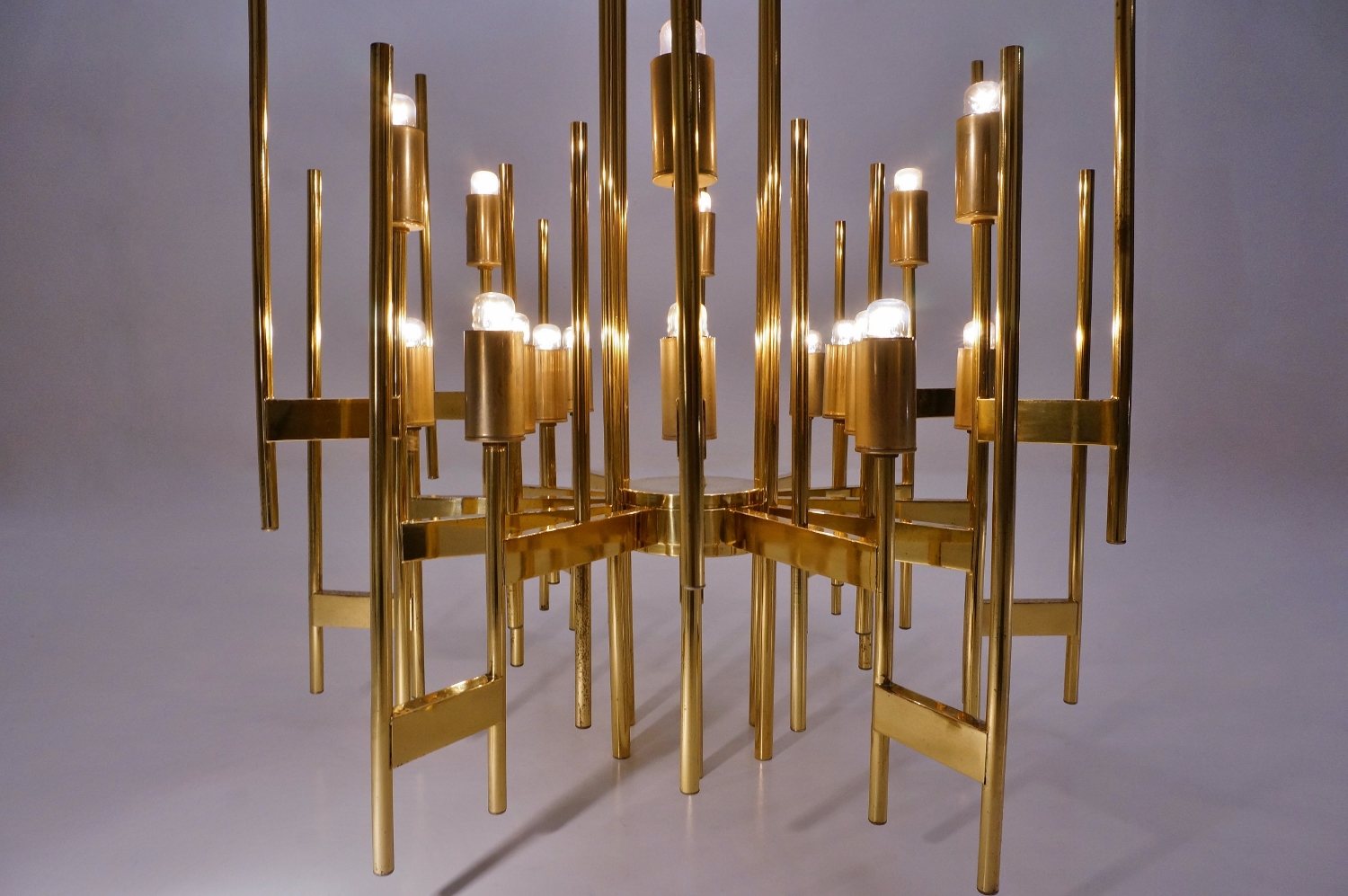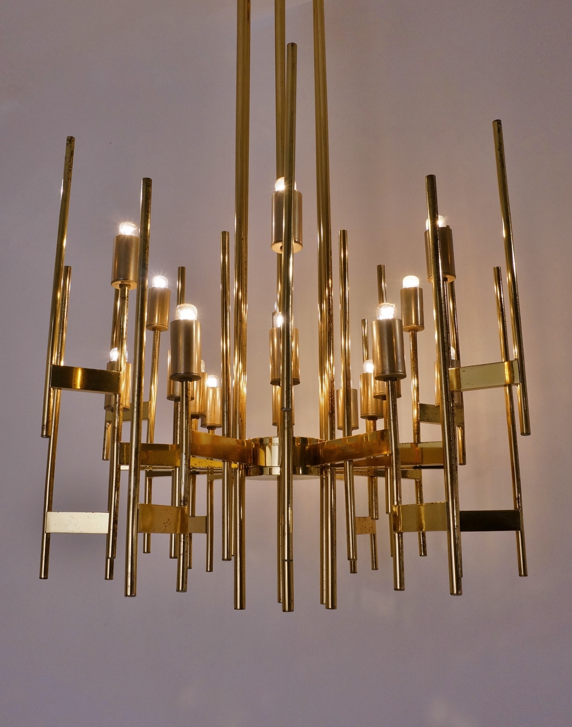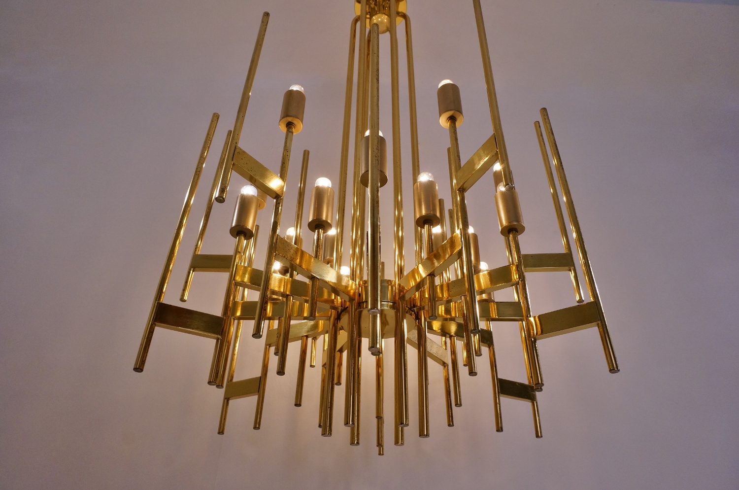 This Modernist sculptural chandelier is Gaetano Sciolari`s Minimalist re-interpretation of a traditional design. It is one of his most sought after designs; one as large as this and in solid brass is very rare to find.