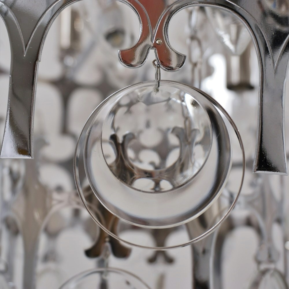 The medium & bottom tiers hang from the bottom side; attaching to the 6 arms by small link silver chains. Both repeat the pattern of the main canopy of alternated circular optical crystals with silver metal frames. The medium tier has 12 crystals & the bottom tier has 6 crystals.