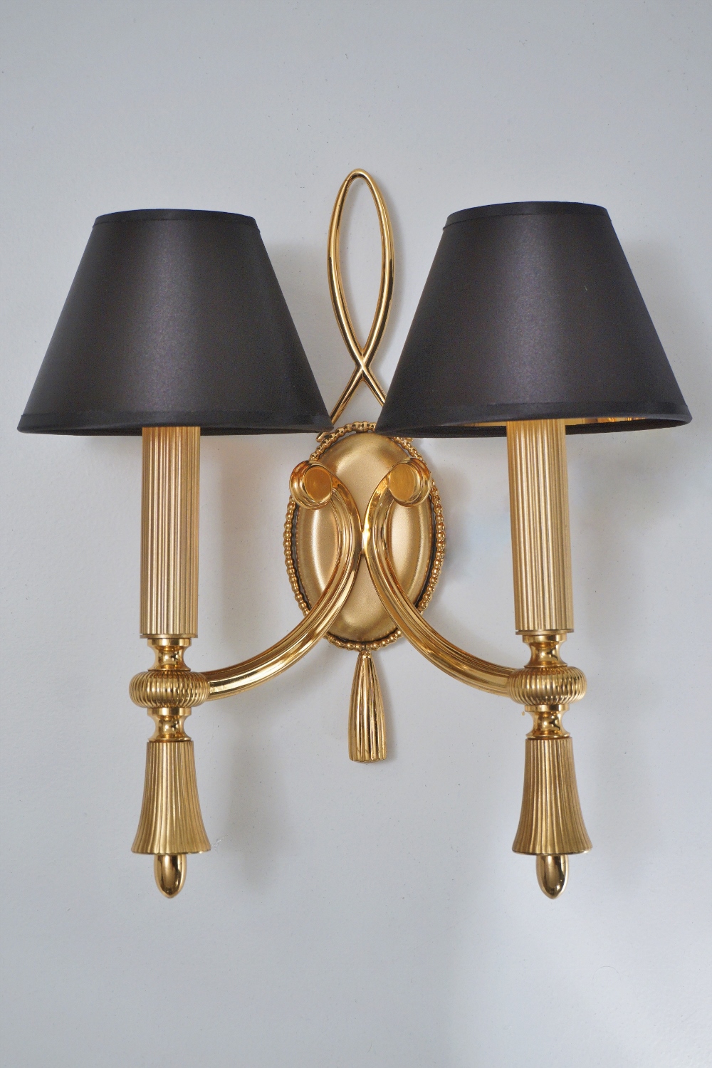 From this cartouche base spreads out 2 scrolling arms in polished brass. These rise slightly upwards in a candelabra like form. The bottom portion of each arm holds a lamp holder. Each has a brass candle cover with textured fluting. Following this textured pattern there is a bun shaped bobeche contrasted by 2 two break necks in polished brass. This is finished with a tassel finial. Contrasting textures between the vertical fluting against the polished brass creates different reflections.