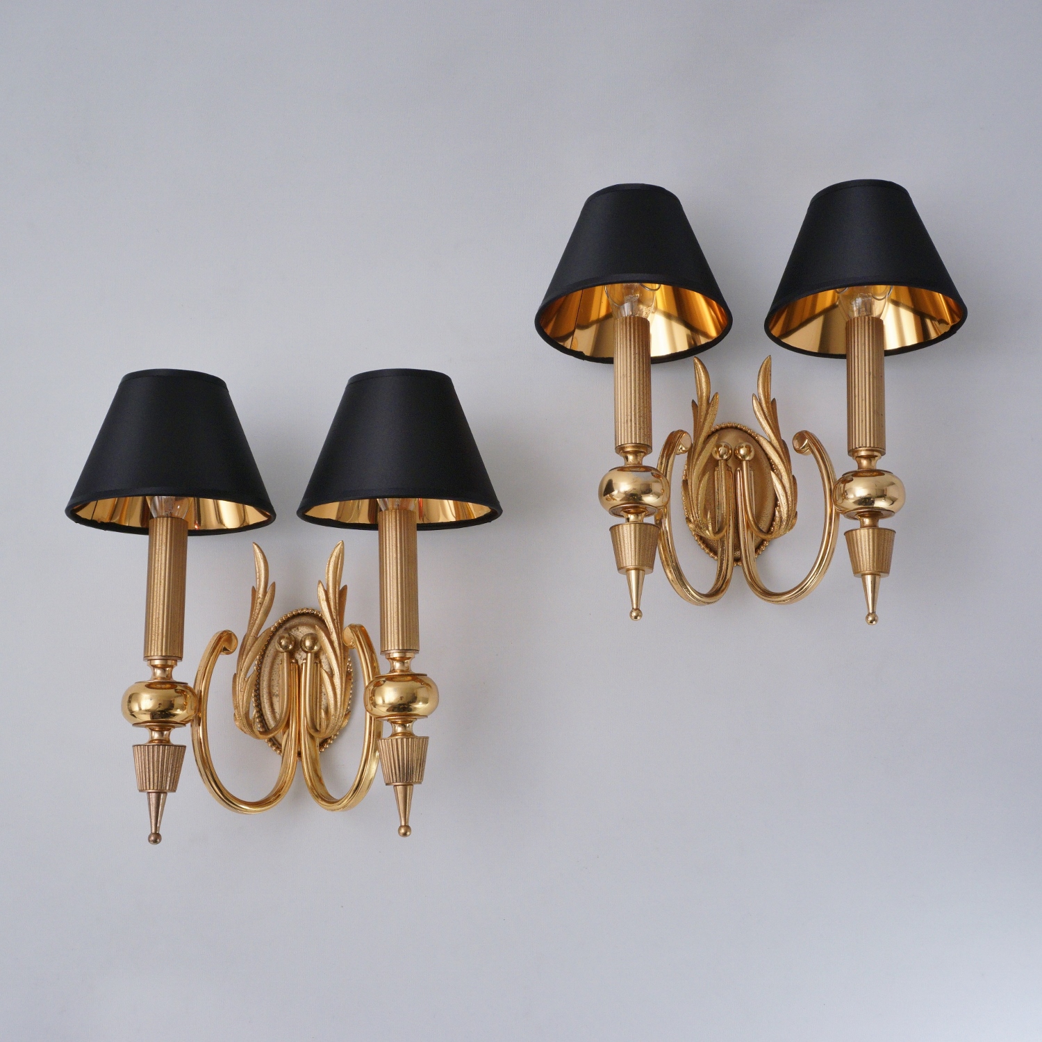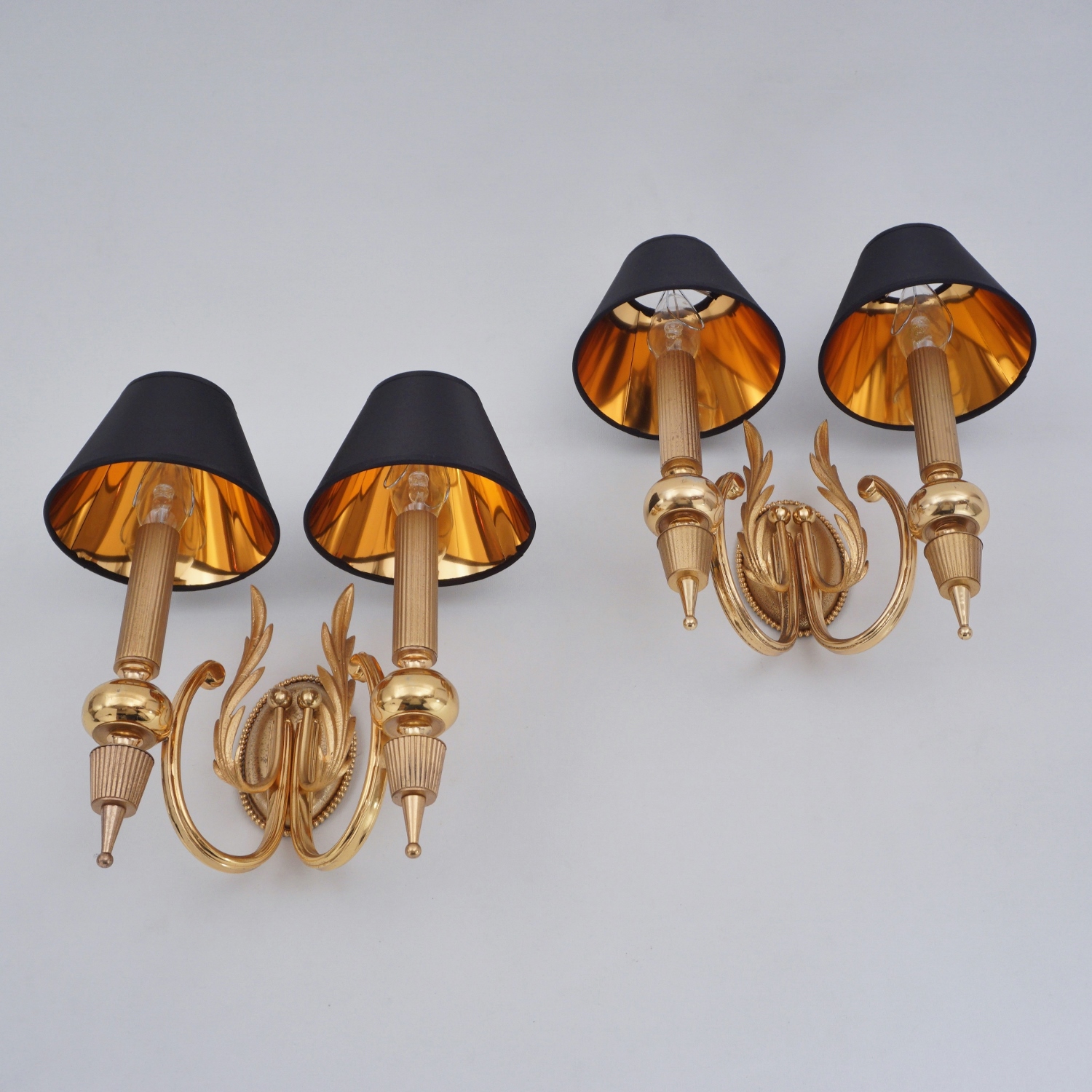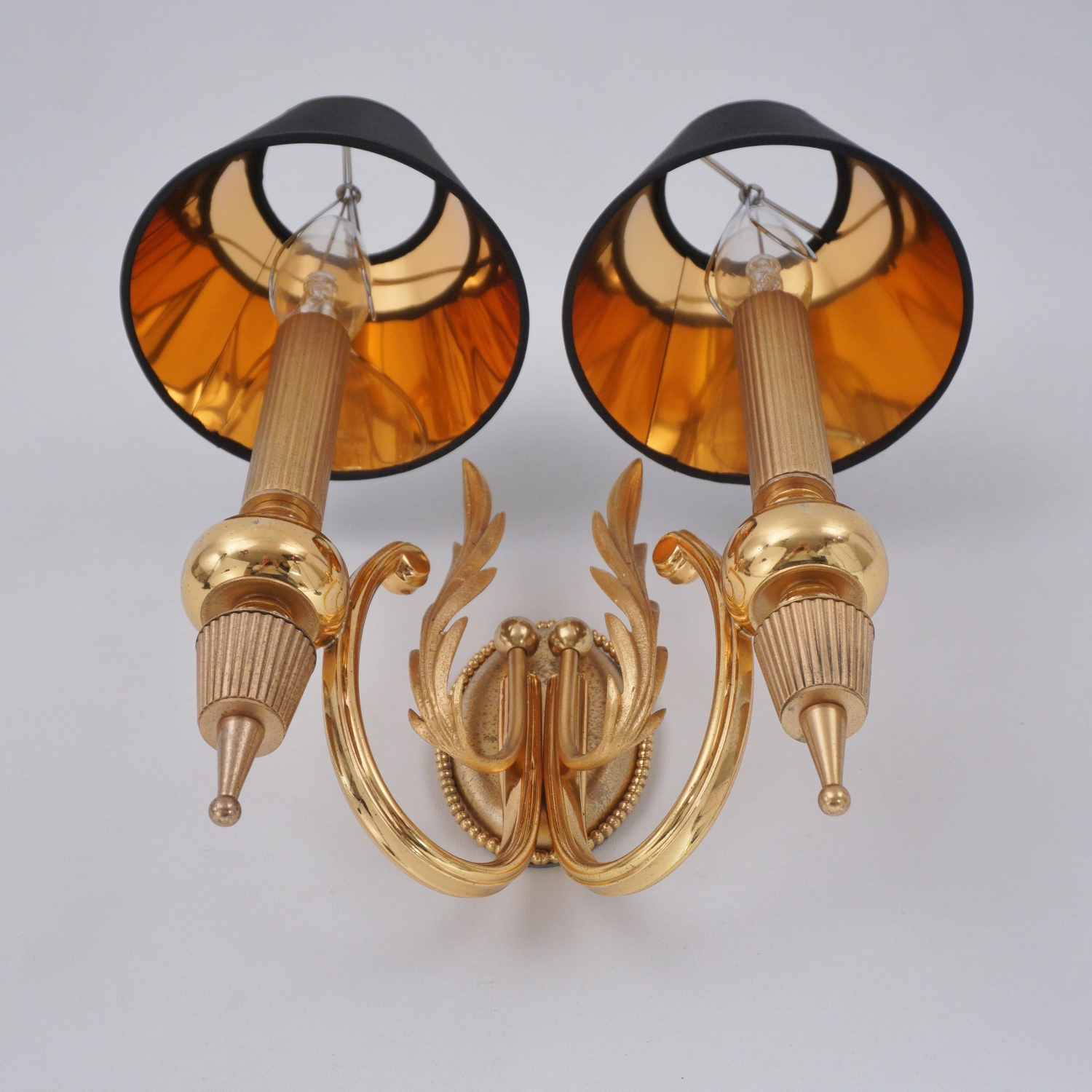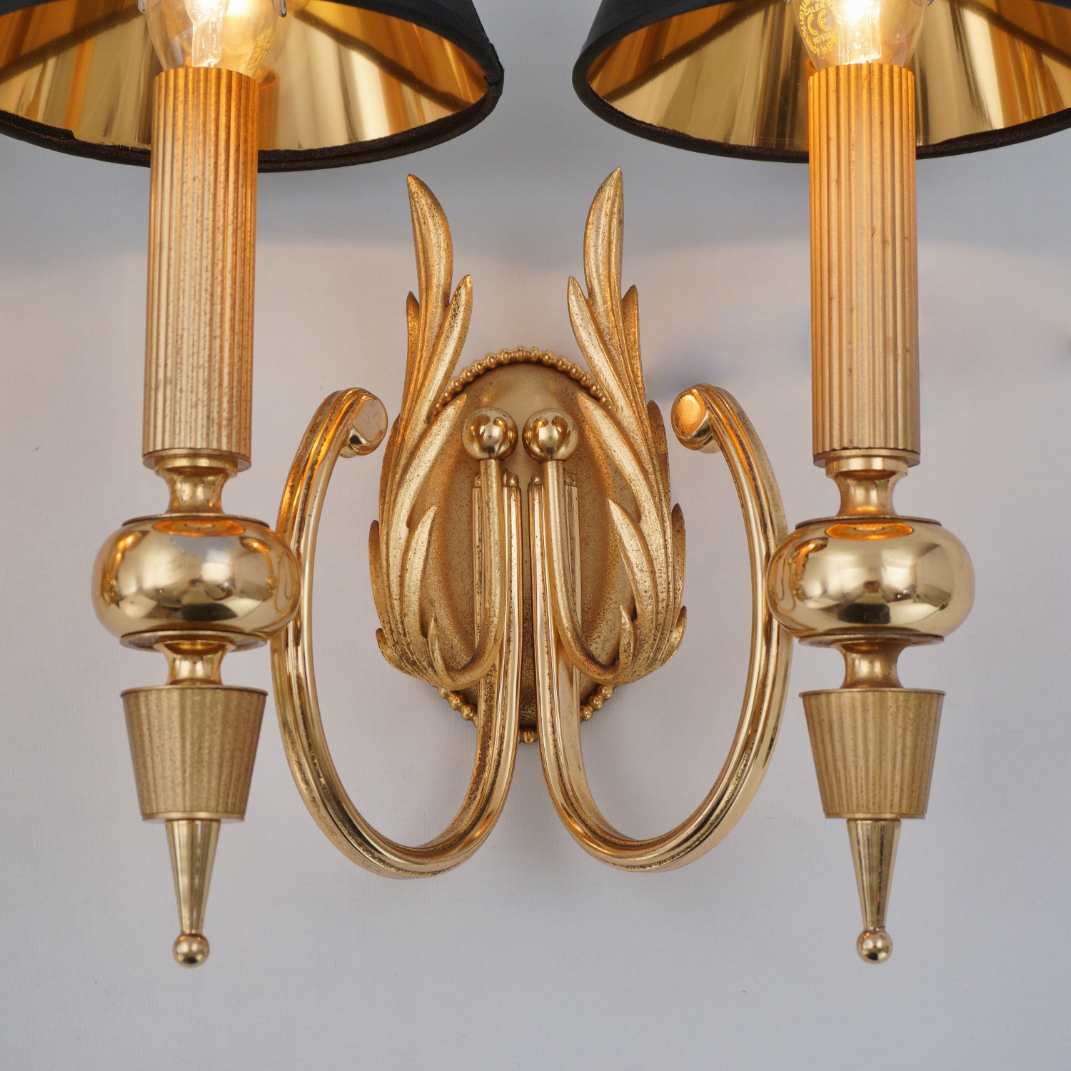 This pair of vintage sconces is in good condition. The metal frames are sound with no damages. The gilt finishes are in good condition, with some age patina and tiny marks in line with age & wear. There is minor rubbing to the gilt in places, slightly more noticeable in one of the bulbous forms. The lampshades are new and in very good condition.