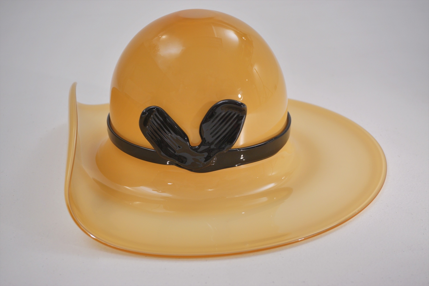 The Murano Art glass hat is in a shade of orange/yellow & white tones, made with the famous Italian "incamiciato" technique. This is a glass consisting of two superimposed layers of lattimo glass and of coloured transparent glass.
