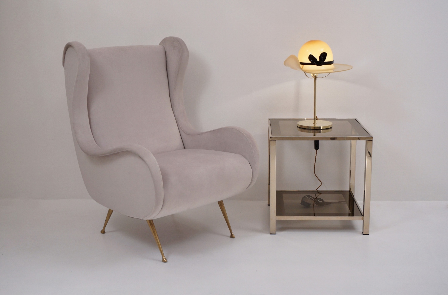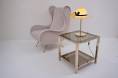 The frame continues downwards as a column in polished brass. At the bottom there is a round solid polished brass plate, which is weighted for good stability. The flat surface underneath has black felt to protect furniture.
