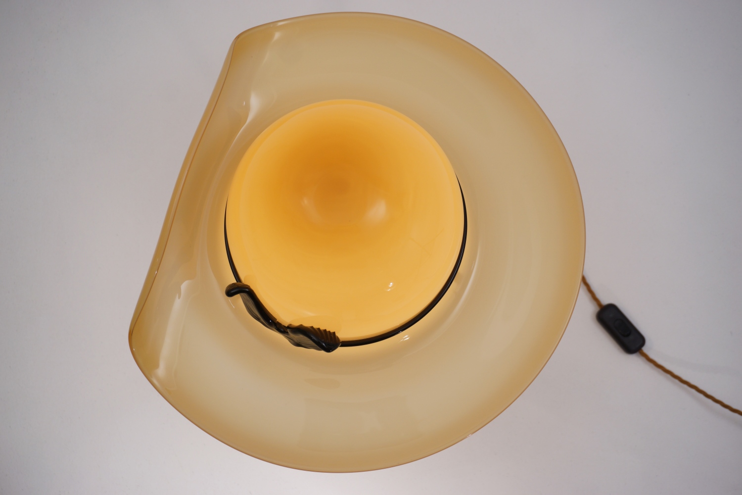 Although unmarked, this elegant vintage table lamp has many of the features of the work of the Italian Company Venini, the attributed manufacturer. The company is known for its sculptural glass hat designs from the 1950`s.