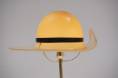 The outside layer is in orange/yellow while the inside of the hat is lighter, almost white. The hat is decorated with a handmade black glass bow. The hat has on the outside at the top a small flat surface that allows it to stand alone, turned around, as a decoration on a table.