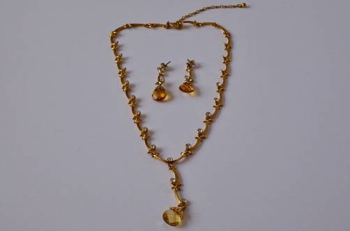 From the centre of this necklace hangs a regal faux citrine faceted by hand. The earrings have a similar but slightly smaller citrine drop. The light-yellow colour of the stone is subtle and fitting for the baroque foliate swag of the gilt metal chain. The scalloped pattern of the chain is punctuated with rhinestones. The result is feminine & princess-like.