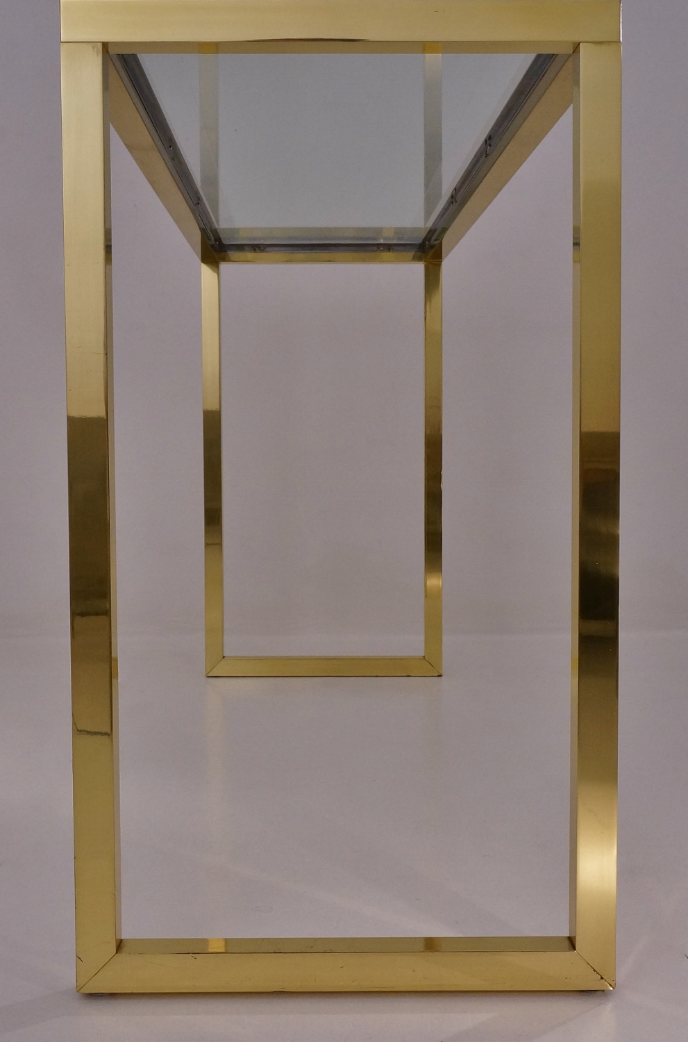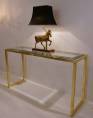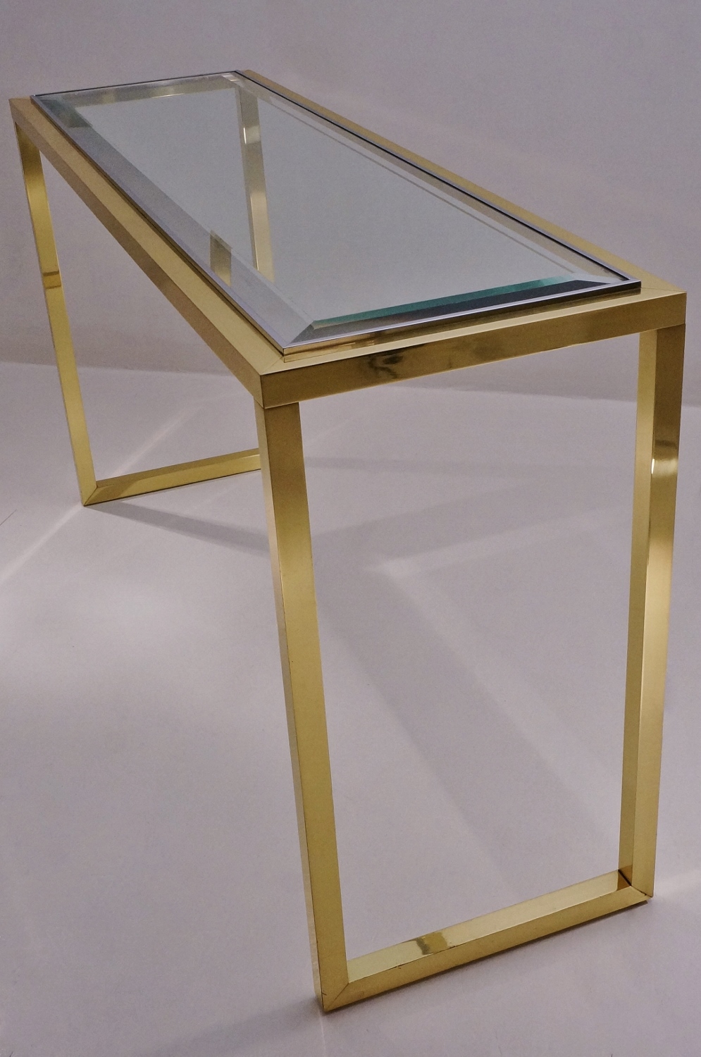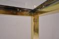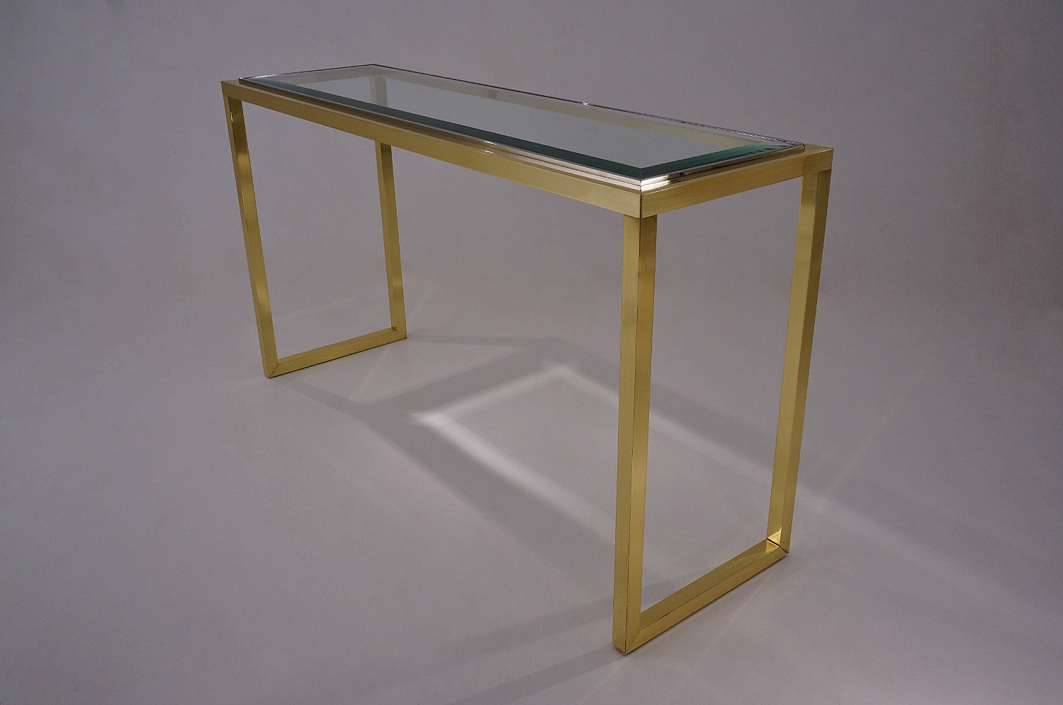 The console table has a rectangular Neoclassical frame consisting of a square section of solid brass frame with a polished finish. The proportions of the top of the frame are repeated in the design of the legs. Together the brass frame appears to flow continuously. The chrome trim is a smart detail which also serves to securely hold the clear glass top.
