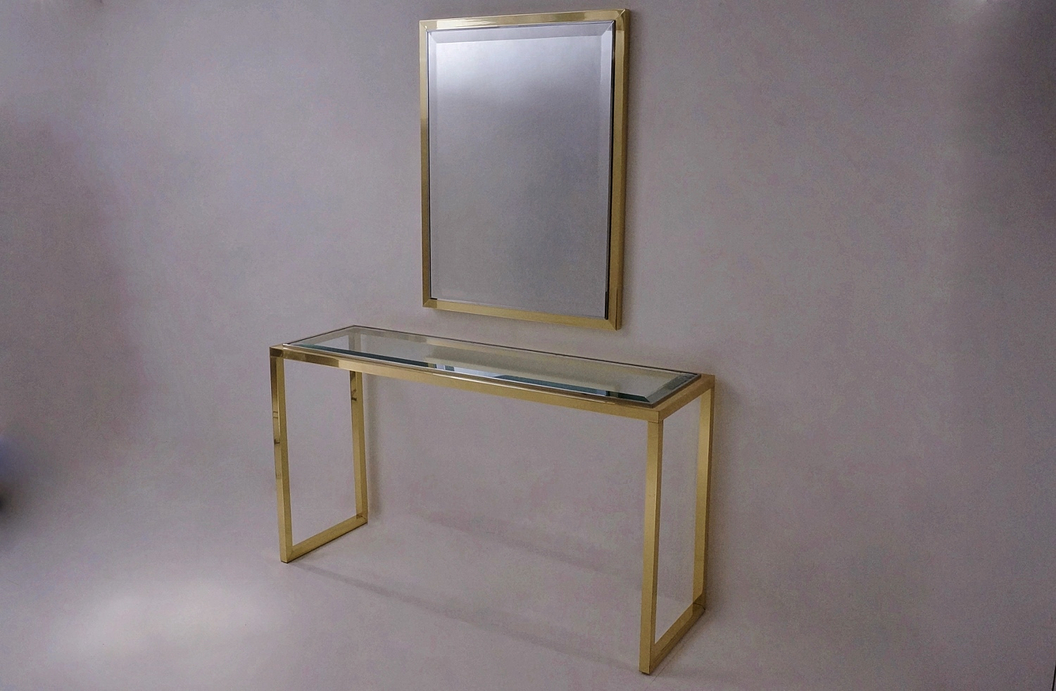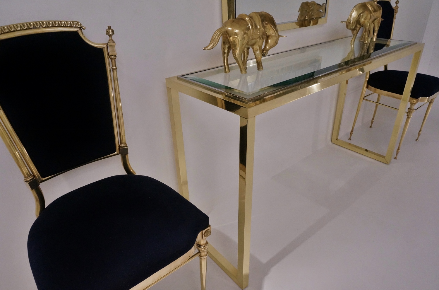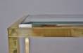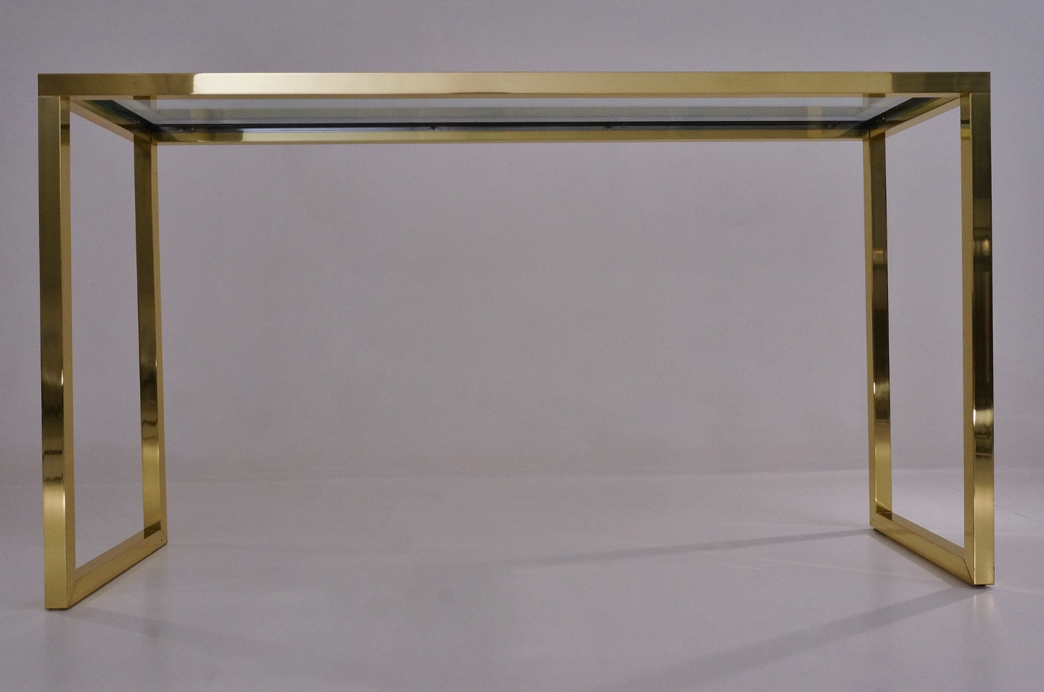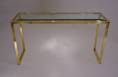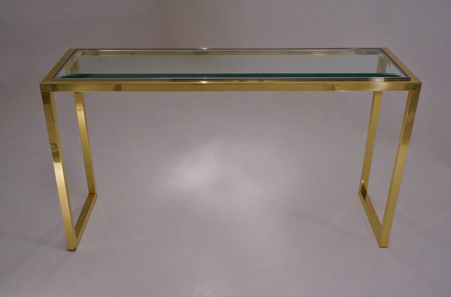 The console table has a rectangular Neoclassical frame consisting of a square section of solid brass frame with a polished finish. The proportions of the top of the frame are repeated in the design of the legs. Together the brass frame appears to flow continuously. The chrome trim is a smart detail which also serves to securely hold the clear glass top.