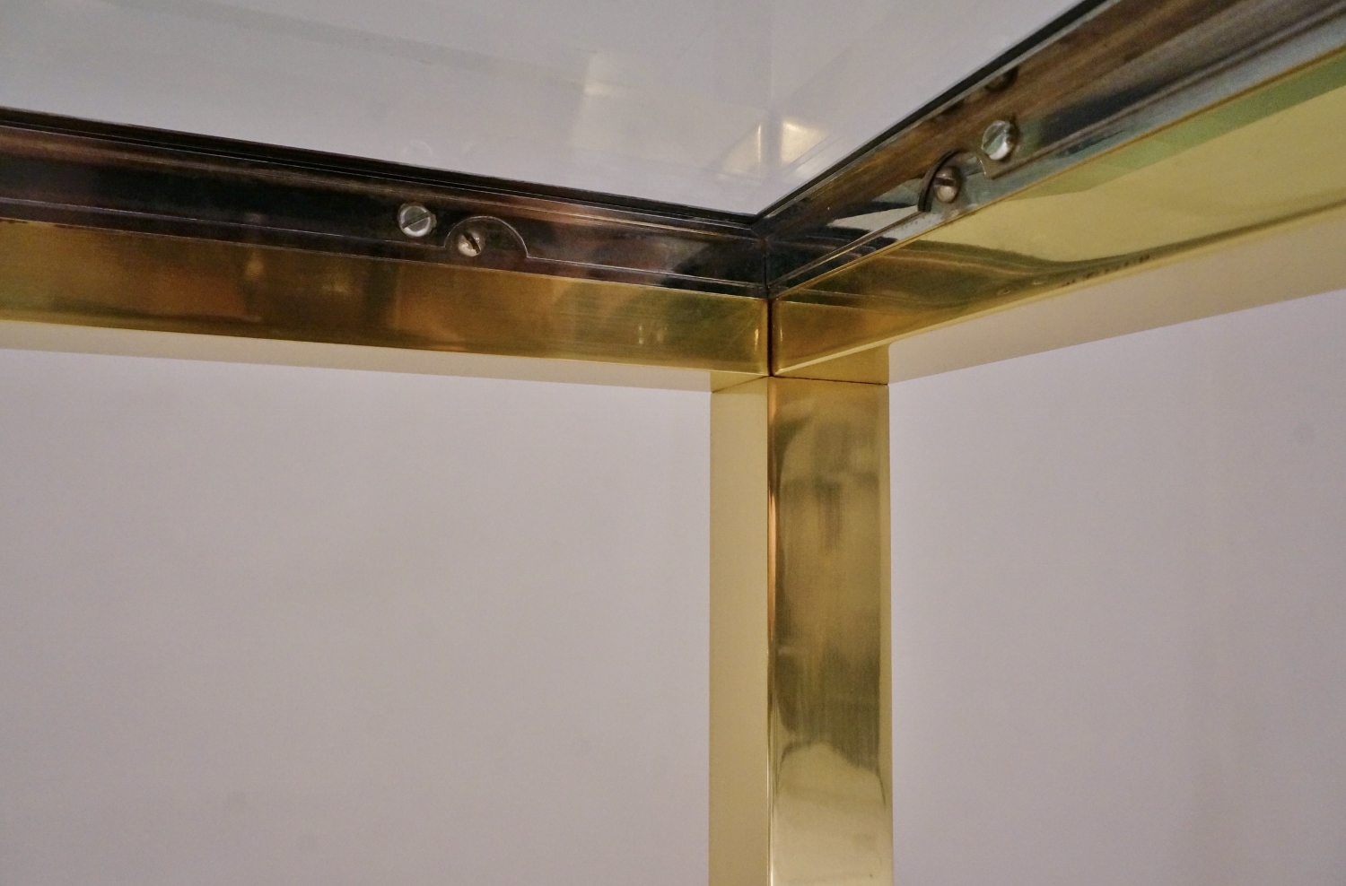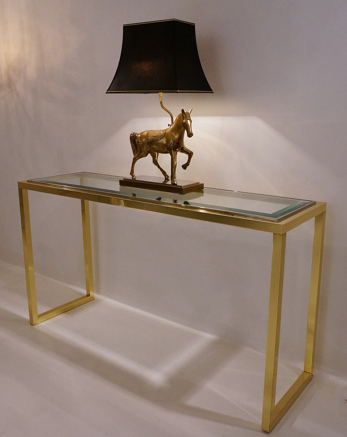 This console table is in very good condition. The solid brass frame has the original lacquer present and only minor marks for a warm aged patina.The glass has a few minor surface scratches in line with age & wear but no cracks or chips.