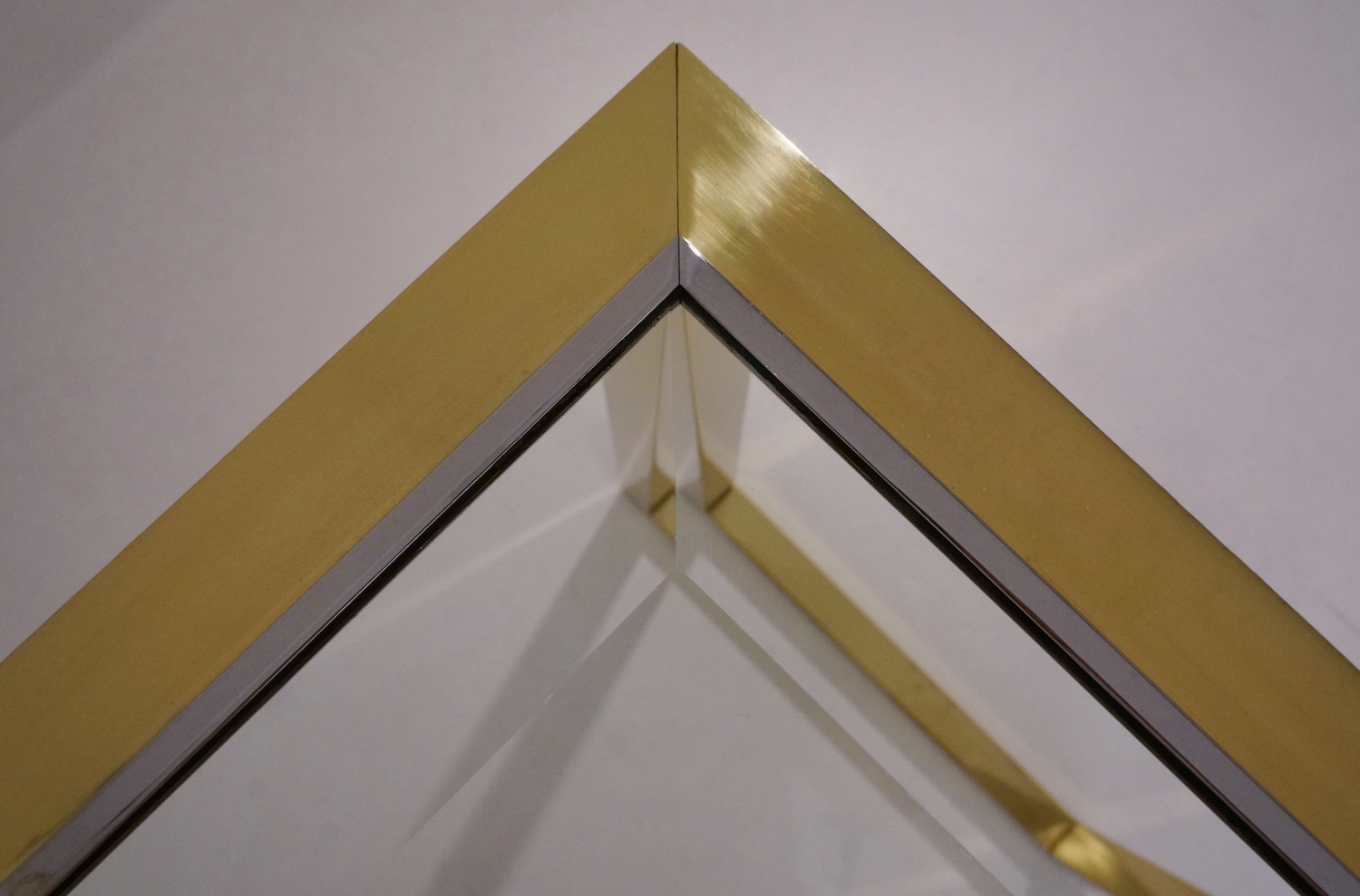 The glass top is the original vintage, and has an attractive unusual bevelled edge of 3.5 cm wide. Together the bevelled glass edge & chrome trim add depth, elegance and glamour to the minimalist design.